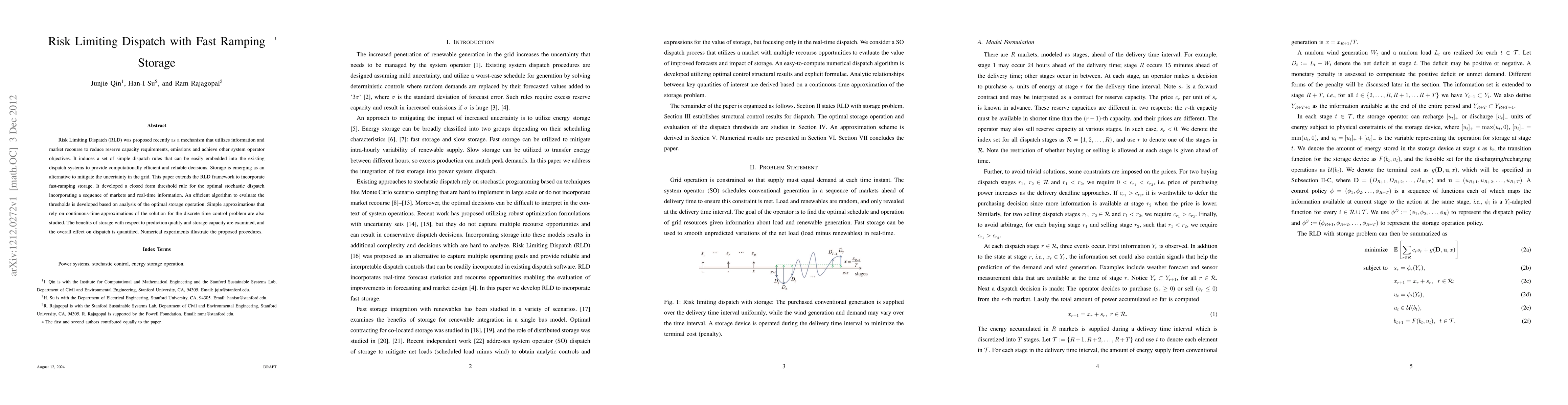 Risk Limiting Dispatch (RLD) was proposed recently as a mechanism that utilizes information and market recourse to reduce reserve capacity requirements, emissions and achieve other system operator objectives. It induces a set of simple dispatch rules that can be easily embedded into the existing dispatch systems to provide computationally efficient and reliable decisions. Storage is emerging as an alternative to mitigate the uncertainty in the grid. This paper extends the RLD framework to incorporate fast-ramping storage. It developed a closed form threshold rule for the optimal stochastic dispatch incorporating a sequence of markets and real-time information. An efficient algorithm to evaluate the thresholds is developed based on analysis of the optimal storage operation. Simple approximations that rely on continuous-time approximations of the solution for the discrete time control problem are also studied. The benefits of storage with respect to prediction quality and storage capacity are examined, and the overall effect on dispatch is quantified. Numerical experiments illustrate the proposed procedures.