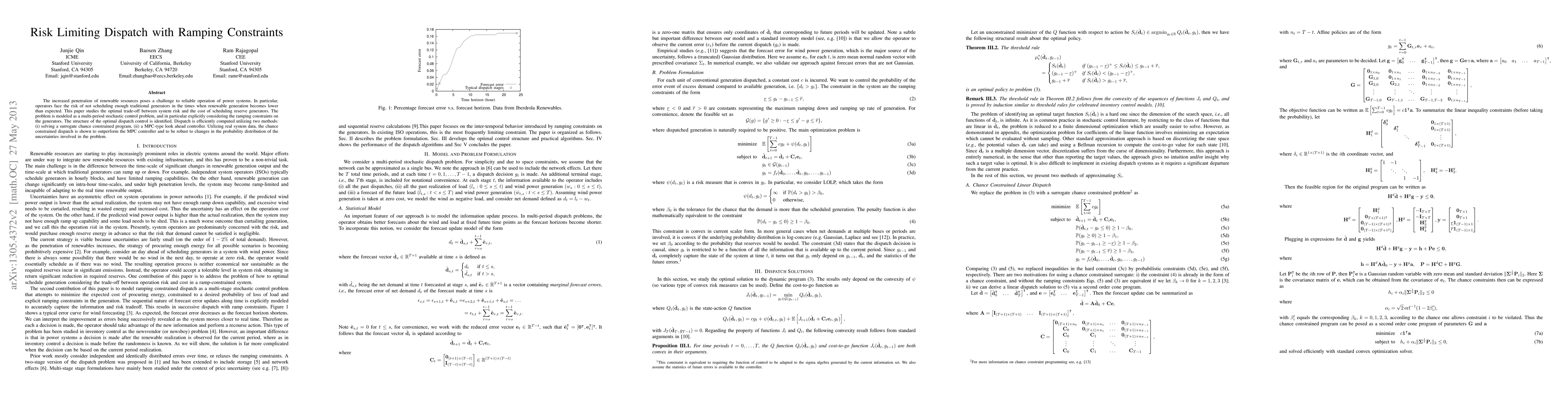 Reliable operation in power systems is becoming more difficult as the penetration of random renewable resources increases. In particular, operators face the risk of not scheduling enough traditional generators in the times when renewable energies becomes lower than expected. In this paper we study the optimal trade-off between system and risk, and the cost of scheduling reserve generators. We explicitly model the ramping constraints on the generators. We model the problem as a multi-period stochastic control problem, and we show the structure of the optimal dispatch. We then show how to efficiently compute the dispatch using two methods: i) solving a surrogate chance constrained program, ii) a MPC-type look ahead controller. Using real world data, we show the chance constrained dispatch outperforms the MPC controller and is also robust to changes in the probability distribution of the renewables.