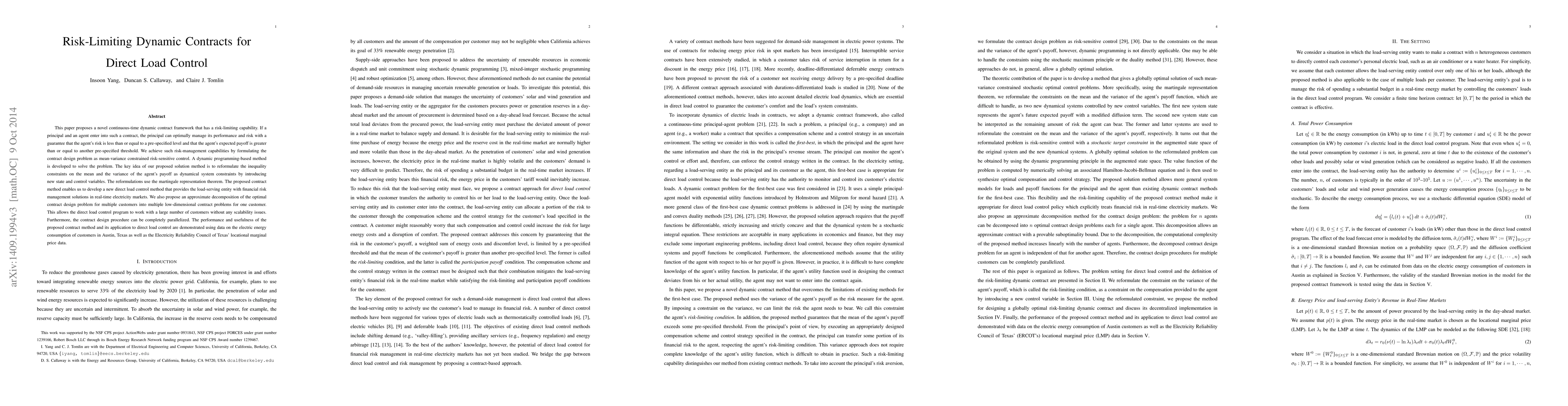 This paper proposes a novel continuous-time dynamic contract framework that has a risk-limiting capability. If a principal and an agent enter into such a contract, the principal can optimally manage its performance and risk with a guarantee that the agent's risk is less than or equal to a pre-specified level and that the agent's expected payoff is greater than or equal to another pre-specified threshold. We achieve such risk-management capabilities by formulating the contract design problem as mean-variance constrained risk-sensitive control. A dynamic programming-based method is developed to solve the problem. The key idea of our proposed solution method is to reformulate the inequality constraints on the mean and the variance of the agent's payoff as dynamical system constraints by introducing new state and control variables. The reformulations use the martingale representation theorem. The proposed contract method enables us to develop a new direct load control method that provides the load-serving entity with financial risk management solutions in real-time electricity markets. We also propose an approximate decomposition of the optimal contract design problem for multiple customers into multiple low-dimensional contract problems for one customer. This allows the direct load control program to work with a large number of customers without any scalability issues. Furthermore, the contract design procedure can be completely parallelized. The performance and usefulness of the proposed contract method and its application to direct load control are demonstrated using data on the electric energy consumption of customers in Austin, Texas as well as the Electricity Reliability Council of Texas' locational marginal price data.
