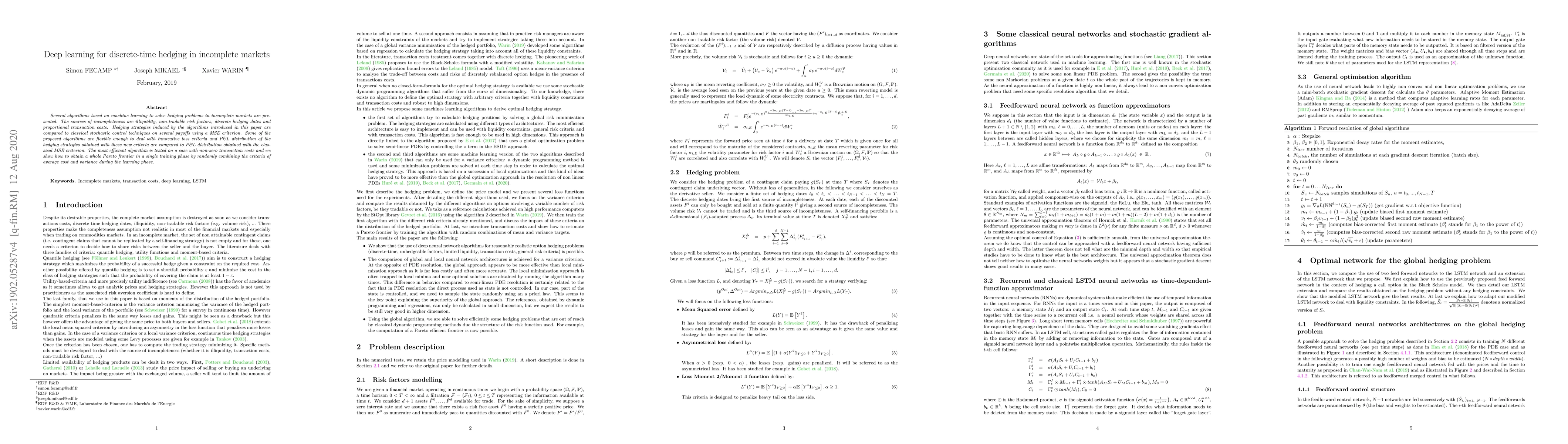 This paper introduces machine-learning algorithms to address hedging problems in incomplete markets, considering factors like illiquidity and transaction costs. The proposed strategies are evaluated against classical stochastic control techniques using a variance criterion, with one algorithm adaptable to various risk criteria, and a new moment-based risk criterion is also proposed.