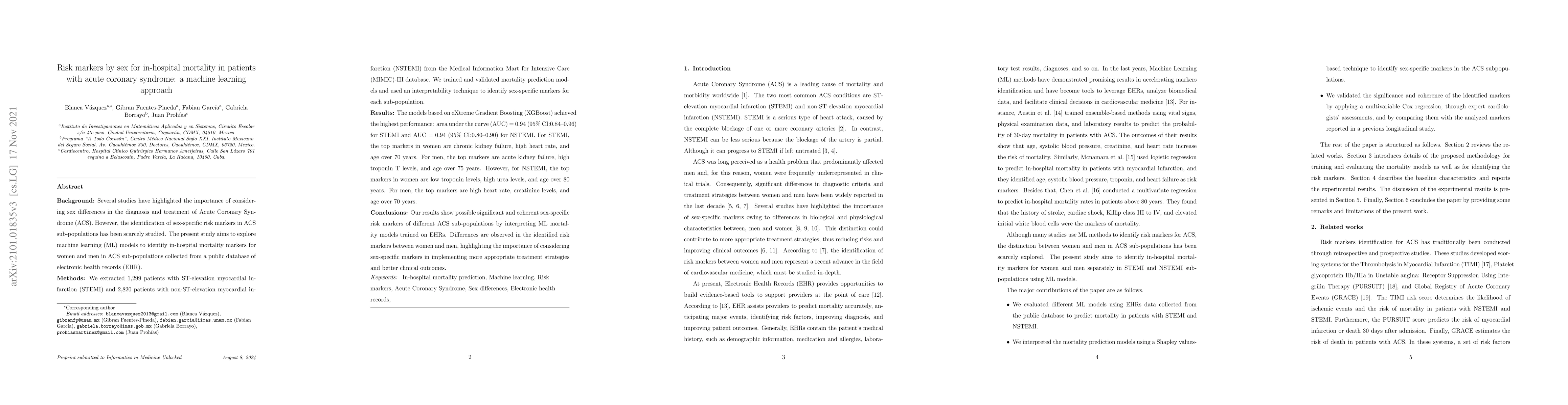 This study uses machine learning to identify sex-specific risk markers for in-hospital mortality in patients with acute coronary syndrome (ACS), revealing distinct markers for STEMI and NSTEMI in women and men. The findings underscore the need for tailored treatment strategies based on sex-specific risk factors.