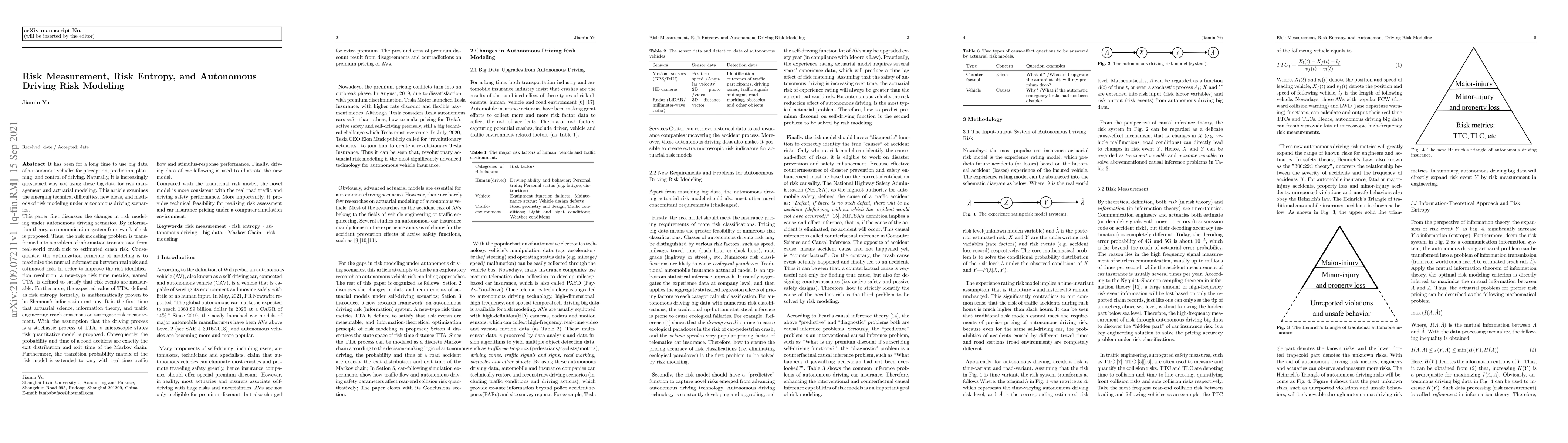 This paper explores the application of big data in autonomous driving for risk management and actuarial modeling, proposing a novel risk entropy model that better aligns with real road traffic and driving safety. It demonstrates the technical feasibility of risk assessment and car insurance pricing through computer simulation.