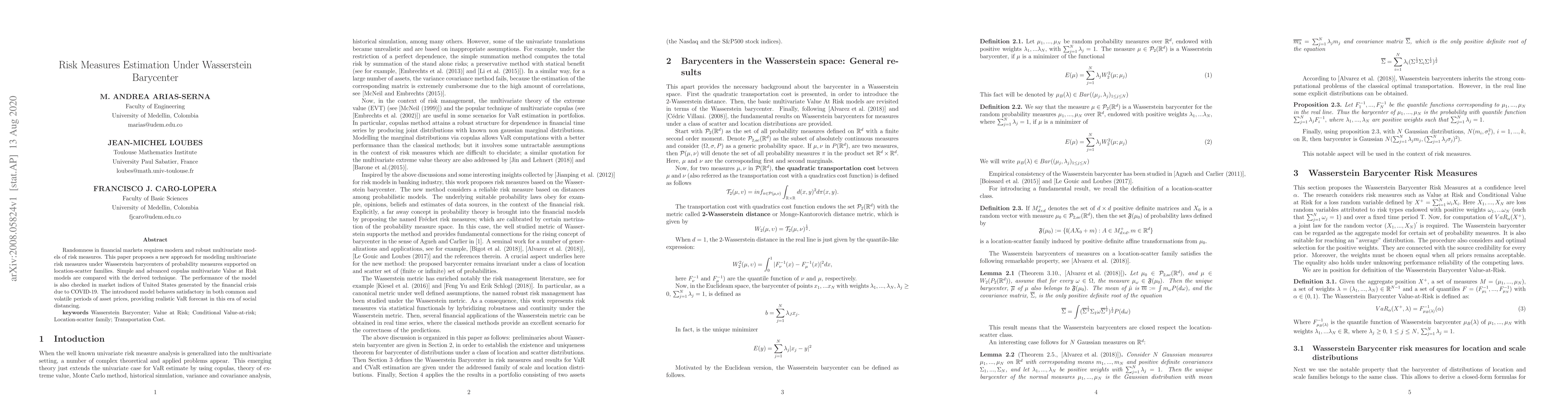 Randomness in financial markets requires modern and robust multivariate models of risk measures. This paper proposes a new approach for modeling multivariate risk measures under Wasserstein barycenters of probability measures supported on location-scatter families. Simple and advanced copulas multivariate Value at Risk models are compared with the derived technique. The performance of the model is also checked in market indices of United States generated by the financial crisis due to COVID-19. The introduced model behaves satisfactory in both common and volatile periods of asset prices, providing realistic VaR forecast in this era of social distancing.