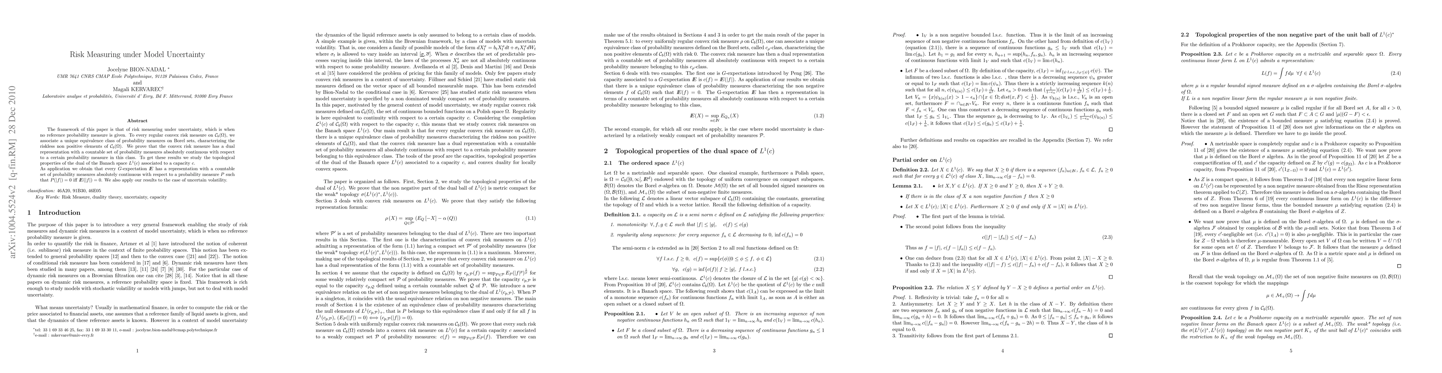 This paper explores risk measuring under model uncertainty, proving that convex risk measures have a dual representation with a countable set of probability measures. It provides implications for G-expectations and uncertain volatility applications.