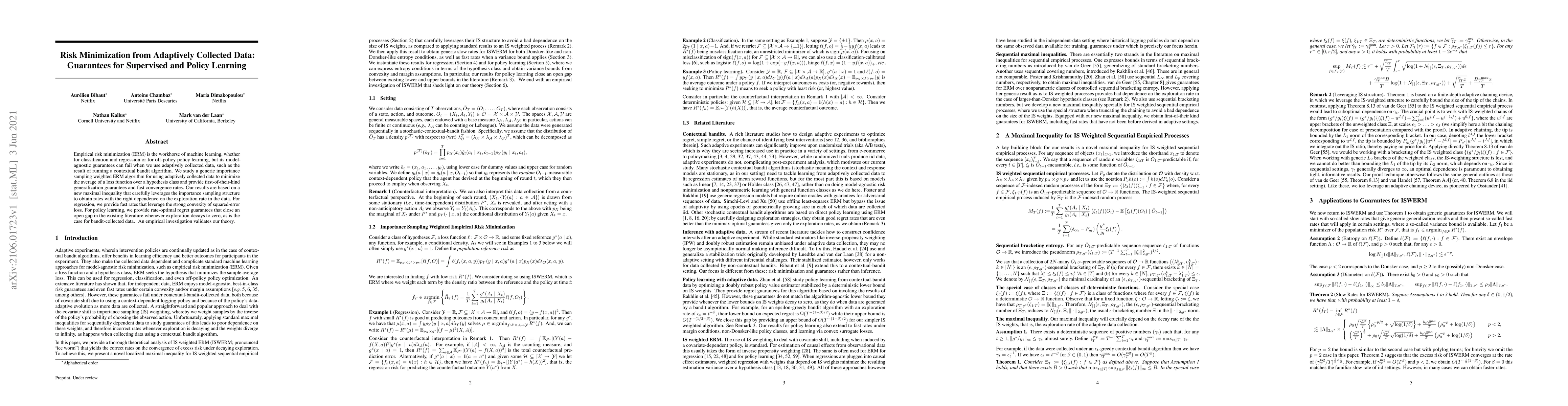 This paper proposes an importance sampling weighted empirical risk minimization algorithm to handle adaptively collected data, providing novel generalization guarantees and fast convergence rates. It achieves rate-optimal regret for policy learning and leverages strong convexity for regression, validated by empirical results.