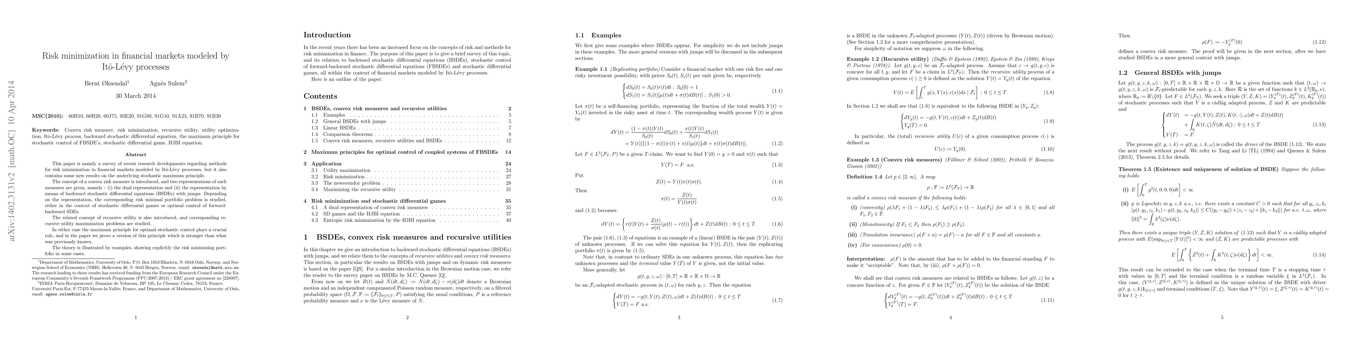 This paper is mainly a survey of recent research developments regarding methods for risk minimization in financial markets modeled by It\^o-L\'evy processes, but it also contains some new results on the underlying stochastic maximum principle. The concept of a convex risk measure is introduced, and two representations of such measures are given, namely: (i) the dual representation and (ii) the representation by means of backward stochastic differential equations (BSDEs) with jumps. Depending on the representation, the corresponding risk minimal portfolio problem is studied, either in the context of stochastic differential games or optimal control of forward-backward SDEs. The related concept of recursive utility is also introduced, and corresponding recursive utility maximization problems are studied. In either case the maximum principle for optimal stochastic control plays a crucial role, and in the paper we prove a version of this principle which is stronger than what was previously known. The theory is illustrated by examples, showing explicitly the risk minimizing portfolio in some cases.