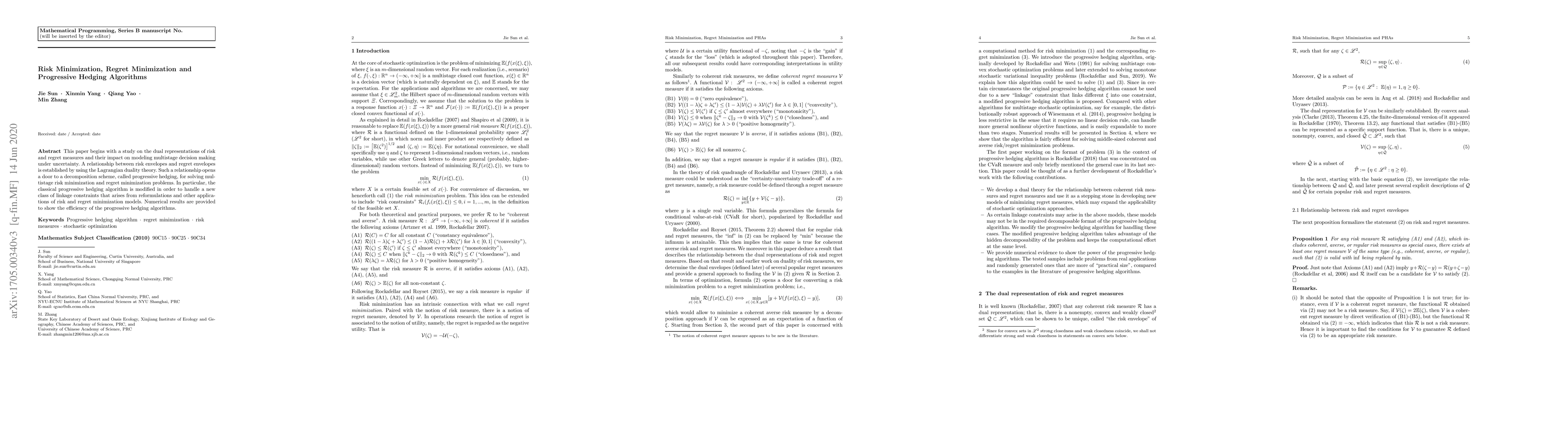 This paper begins with a study on the dual representations of risk and regret measures and their impact on modeling multistage decision making under uncertainty. A relationship between risk envelopes and regret envelopes is established by using the Lagrangian duality theory. Such a relationship opens a door to a decomposition scheme, called progressive hedging, for solving multistage risk minimization and regret minimization problems. In particular, the classical progressive hedging algorithm is modified in order to handle a new class of linkage constraints that arises from reformulations and other applications of risk and regret minimization problems. Numerical results are provided to show the efficiency of the progressive hedging algorithms.