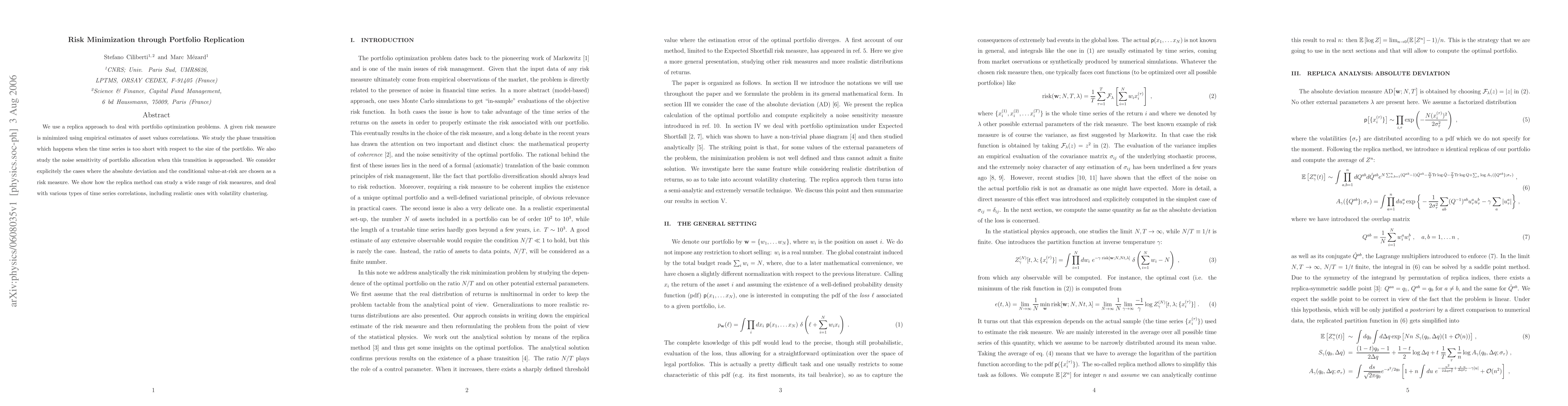 We use a replica approach to deal with portfolio optimization problems. A given risk measure is minimized using empirical estimates of asset values correlations. We study the phase transition which happens when the time series is too short with respect to the size of the portfolio. We also study the noise sensitivity of portfolio allocation when this transition is approached. We consider explicitely the cases where the absolute deviation and the conditional value-at-risk are chosen as a risk measure. We show how the replica method can study a wide range of risk measures, and deal with various types of time series correlations, including realistic ones with volatility clustering.