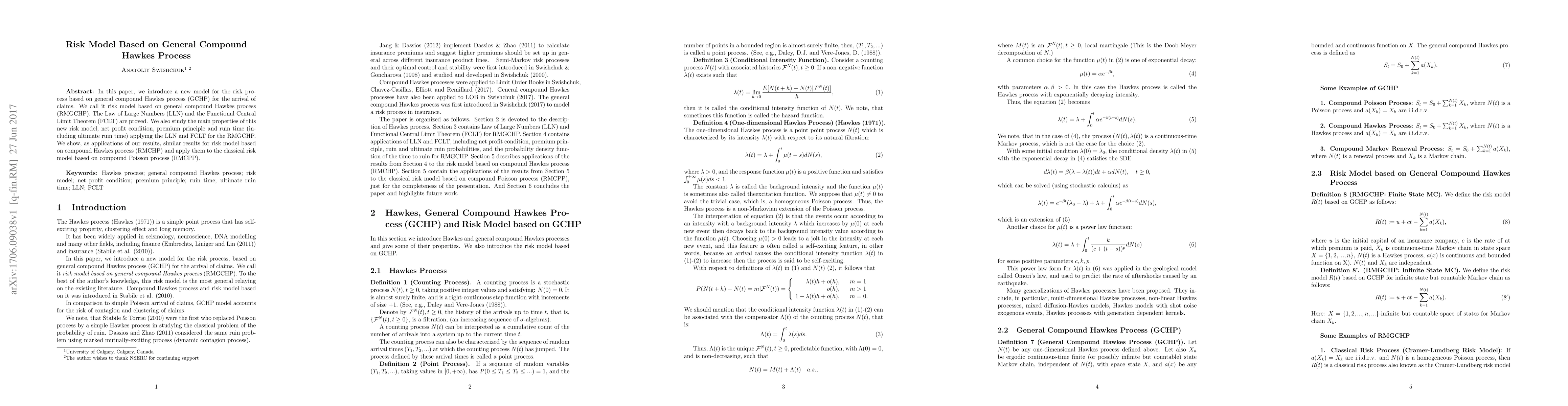 In this paper, we introduce a new model for the risk process based on general compound Hawkes process (GCHP) for the arrival of claims. We call it risk model based on general compound Hawkes process (RMGCHP). The Law of Large Numbers (LLN) and the Functional Central Limit Theorem (FCLT) are proved. We also study the main properties of this new risk model, net profit condition, premium principle and ruin time (including ultimate ruin time) applying the LLN and FCLT for the RMGCHP. We show, as applications of our results, similar results for risk model based on compound Hawkes process (RMCHP) and apply them to the classical risk model based on compound Poisson process (RMCPP).