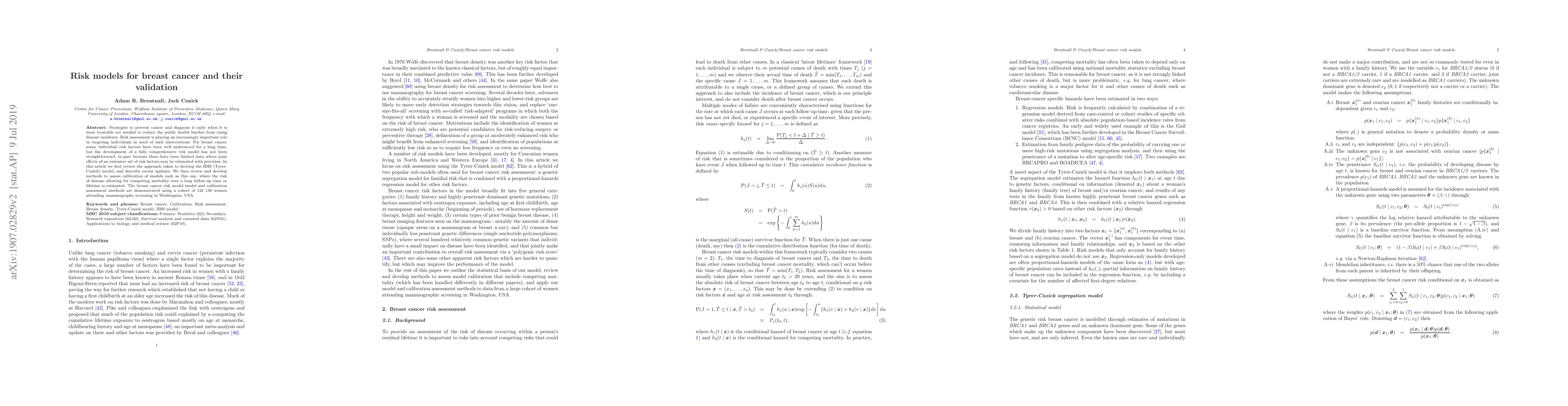 Strategies to prevent cancer and diagnose it early when it is most treatable are needed to reduce the public health burden from rising disease incidence. Risk assessment is playing an increasingly important role in targeting individuals in need of such interventions. For breast cancer many individual risk factors have been well understood for a long time, but the development of a fully comprehensive risk model has not been straightforward, in part because there have been limited data where joint effects of an extensive set of risk factors may be estimated with precision. In this article we first review the approach taken to develop the IBIS (Tyrer-Cuzick) model, and describe recent updates. We then review and develop methods to assess calibration of models such as this one, where the risk of disease allowing for competing mortality over a long follow-up time or lifetime is estimated. The breast cancer risk model model and calibration assessment methods are demonstrated using a cohort of 132 139 women attending mammography screening in Washington, USA.