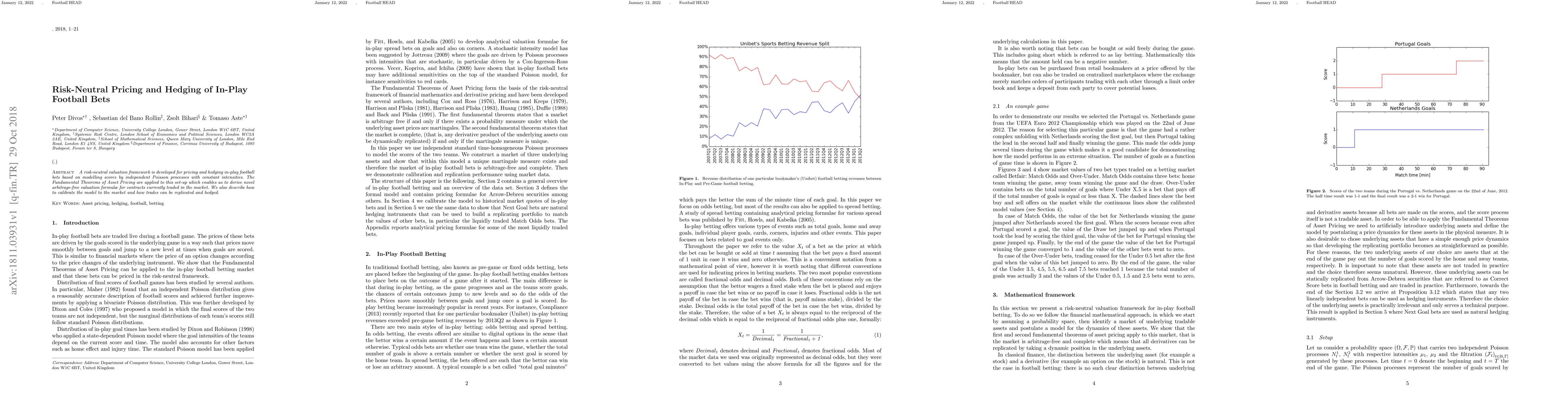 This paper develops a risk-neutral valuation framework for pricing and hedging in-play football bets using Poisson processes. It applies the Fundamental Theorems of Asset Pricing to derive arbitrage-free valuation formulas for market contracts and outlines calibration and hedging strategies.