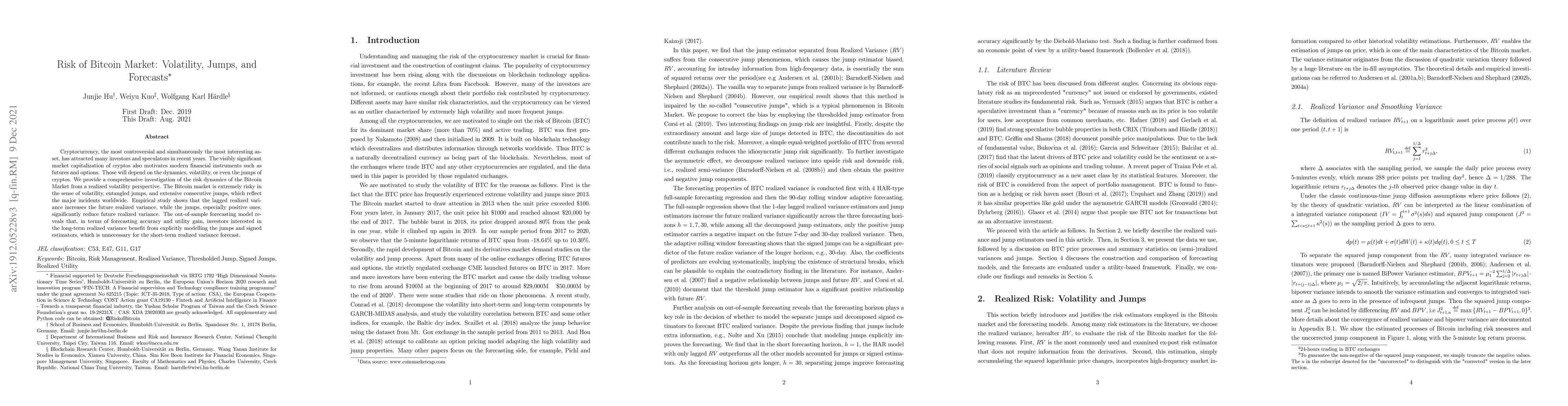 This paper investigates the risk dynamics of the Bitcoin market, focusing on volatility, jumps, and forecasting. It finds that Bitcoin's market is highly volatile with significant jumps, especially positive ones, which reduce future realized variance. For long-term forecasts, modeling jumps and signed estimators improves accuracy.