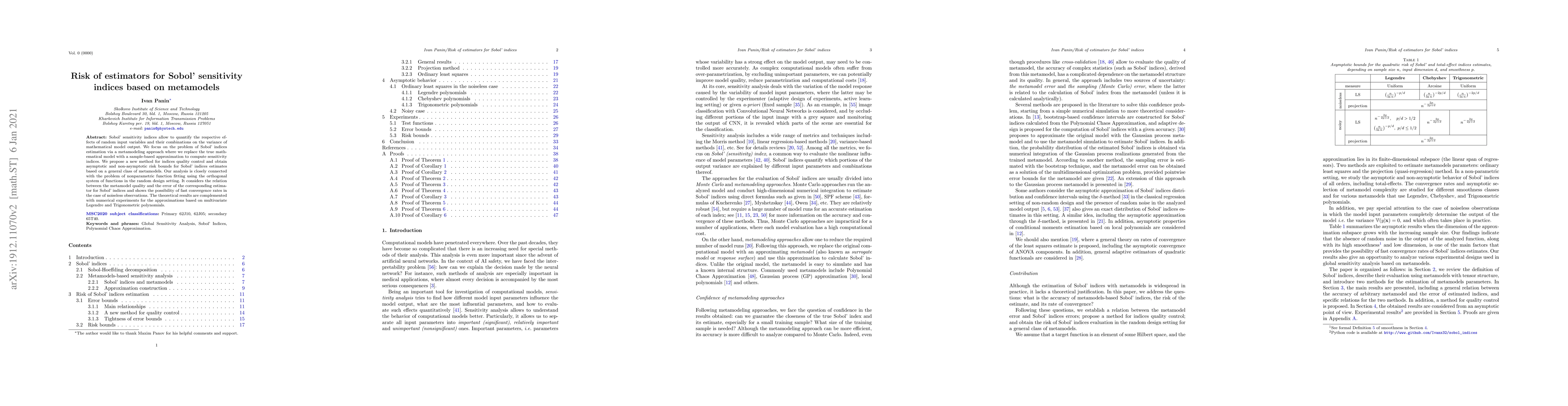 Sobol' sensitivity indices allow to quantify the respective effects of random input variables and their combinations on the variance of mathematical model output. We focus on the problem of Sobol' indices estimation via a metamodeling approach where we replace the true mathematical model with a sample-based approximation to compute sensitivity indices. We propose a new method for indices quality control and obtain asymptotic and non-asymptotic risk bounds for Sobol' indices estimates based on a general class of metamodels. Our analysis is closely connected with the problem of nonparametric function fitting using the orthogonal system of functions in the random design setting. It considers the relation between the metamodel quality and the error of the corresponding estimator for Sobol' indices and shows the possibility of fast convergence rates in the case of noiseless observations. The theoretical results are complemented with numerical experiments for the approximations based on multivariate Legendre and Trigonometric polynomials.