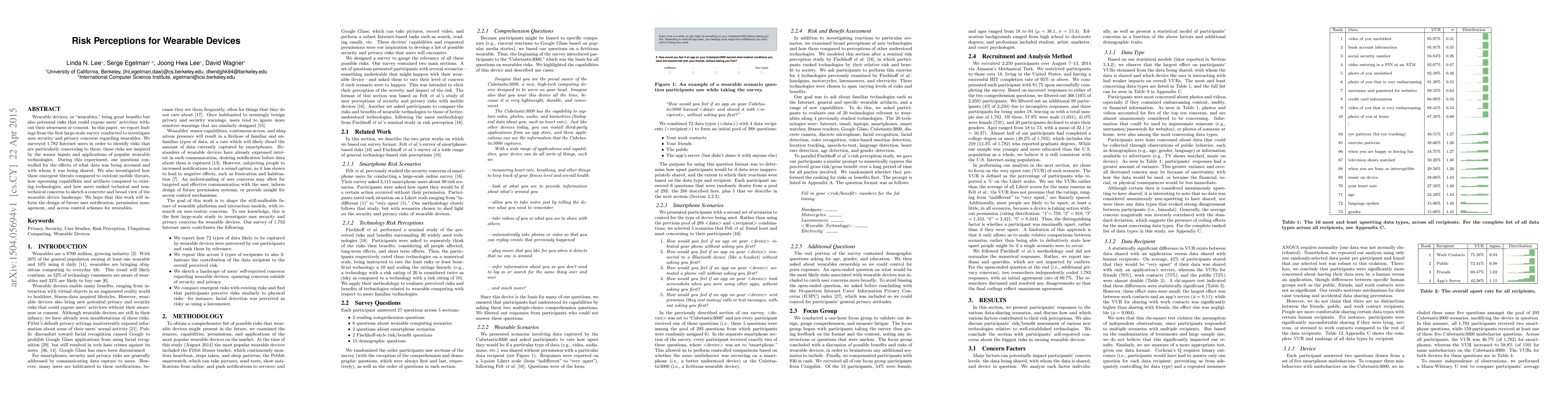Wearable devices, or "wearables," bring great benefits but also potential risks that could expose users' activities with- out their awareness or consent. In this paper, we report findings from the first large-scale survey conducted to investigate user security and privacy concerns regarding wearables. We surveyed 1,782 Internet users in order to identify risks that are particularly concerning to them; these risks are inspired by the sensor inputs and applications of popular wearable technologies. During this experiment, our questions controlled for the effects of what data was being accessed and with whom it was being shared. We also investigated how these emergent threats compared to existent mobile threats, how upcoming capabilities and artifacts compared to existing technologies, and how users ranked technical and nontechnical concerns to sketch a concrete and broad view of the wearable device landscape. We hope that this work will inform the design of future user notification, permission management, and access control schemes for wearables.