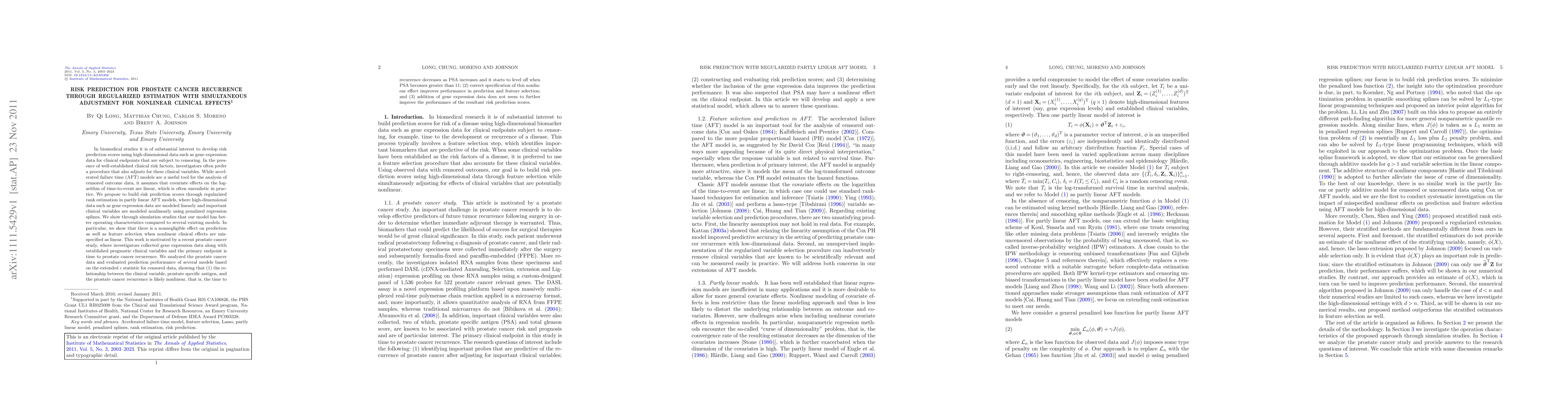 This paper proposes a risk prediction model for prostate cancer recurrence using regularized rank estimation in partly linear accelerated failure time models, which adjusts for both high-dimensional gene expression data and nonlinear clinical effects. The model demonstrates superior performance in prediction and feature selection compared to existing linear models, especially when clinical effects are nonlinear.