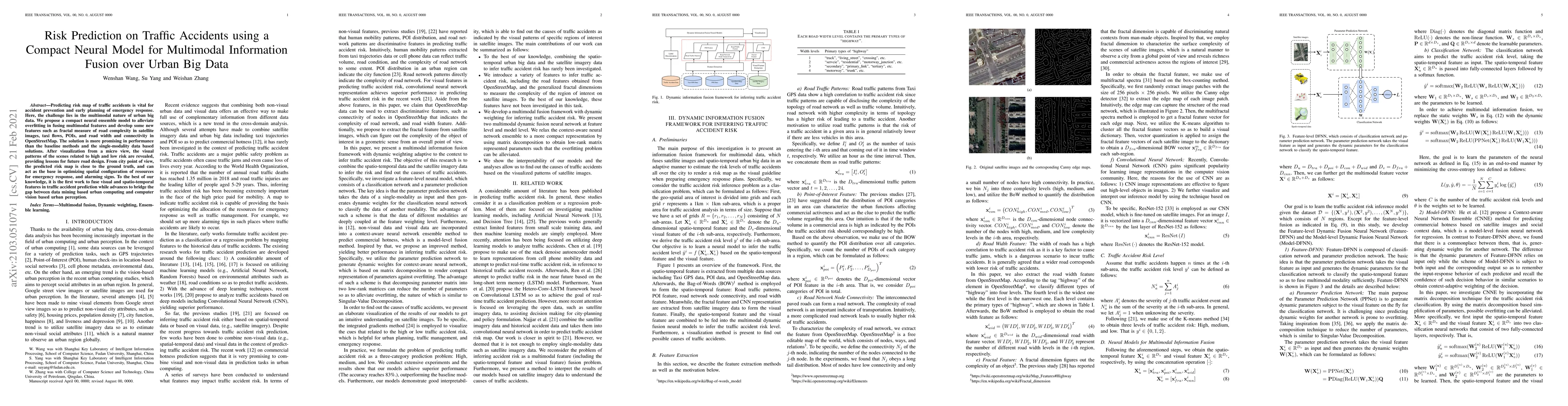 Predicting risk map of traffic accidents is vital for accident prevention and early planning of emergency response. Here, the challenge lies in the multimodal nature of urban big data. We propose a compact neural ensemble model to alleviate overfitting in fusing multimodal features and develop some new features such as fractal measure of road complexity in satellite images, taxi flows, POIs, and road width and connectivity in OpenStreetMap. The solution is more promising in performance than the baseline methods and the single-modality data based solutions. After visualization from a micro view, the visual patterns of the scenes related to high and low risk are revealed, providing lessons for future road design. From city point of view, the predicted risk map is close to the ground truth, and can act as the base in optimizing spatial configuration of resources for emergency response, and alarming signs. To the best of our knowledge, it is the first work to fuse visual and spatio-temporal features in traffic accident prediction while advances to bridge the gap between data mining based urban computing and computer vision based urban perception.
