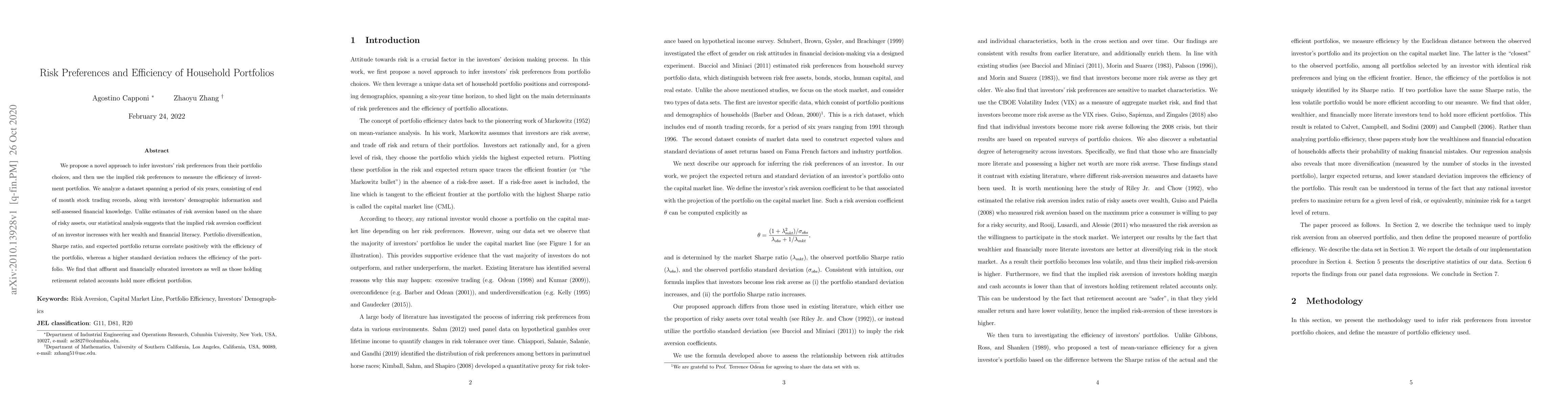 This paper develops a method to infer risk preferences from household portfolio choices and assesses portfolio efficiency based on these preferences. It finds that wealthier and more financially literate investors tend to hold more efficient portfolios, with diversification and higher returns correlating positively with efficiency, while higher volatility reduces it.