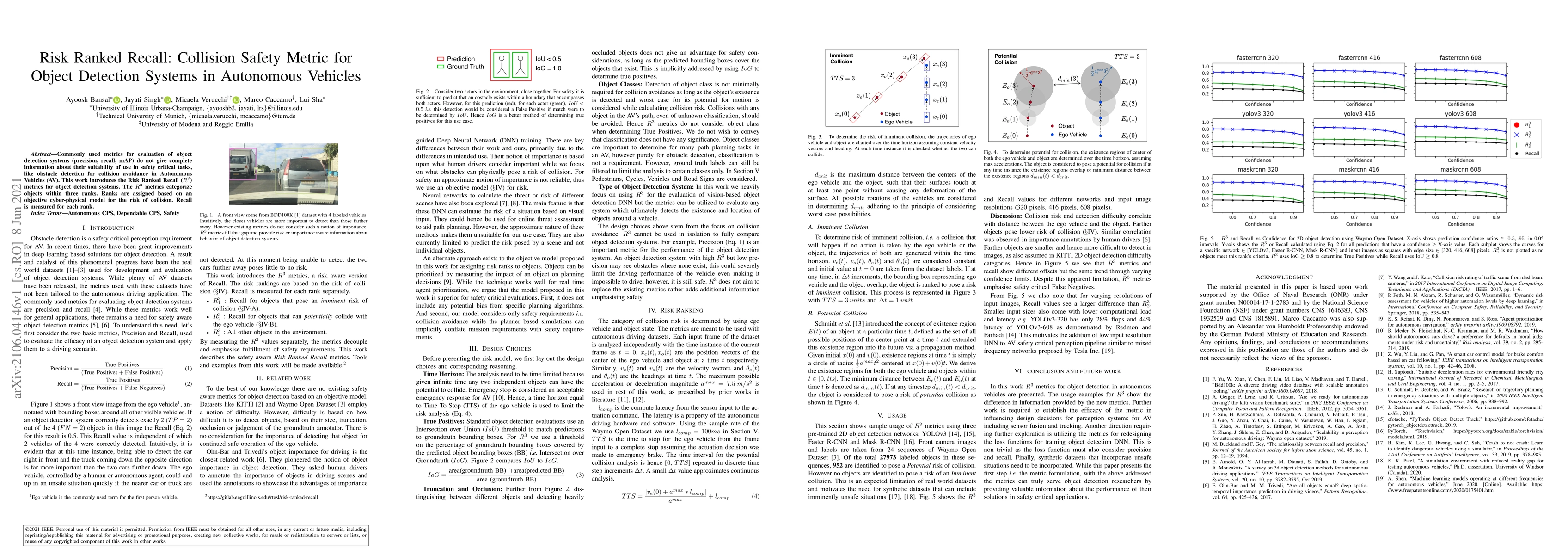 Summary: This paper introduces the Risk Ranked Recall ($R^3$) metric to evaluate object detection systems' suitability for collision avoidance in autonomous vehicles, addressing limitations of existing metrics like precision and recall by categorizing objects into three risk ranks based on a cyber-physical model. Recall is then measured for each rank to provide a more comprehensive safety assessment.