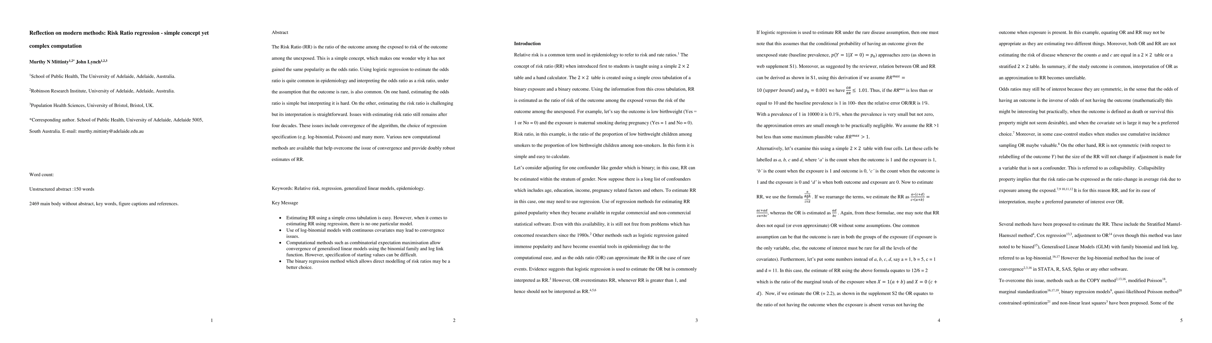 The Risk Ratio (RR) is the ratio of the outcome among the exposed to risk of the outcome among the unexposed. This is a simple concept, which makes one wonder why it has not gained the same popularity as the odds ratio. Using logistic regression to estimate the odds ratio is quite common in epidemiology and interpreting the odds ratio as a risk ratio, under the assumption that the outcome is rare, is also common. On one hand, estimating the odds ratio is simple but interpreting it is hard. On the other, estimating the risk ratio is challenging but its interpretation is straightforward. Issues with estimating risk ratio still remains after four decades. These issues include convergence of the algorithm, the choice of regression specification (e.g. log-binomial, Poisson) and many more. Various new computational methods are available that help overcome the issue of convergence and provide doubly robust estimates of RR.