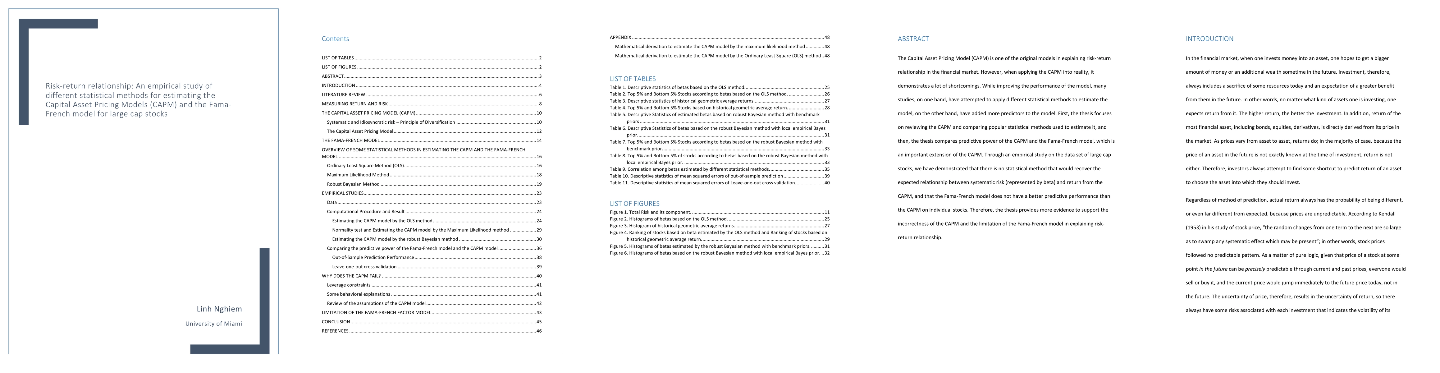 The Capital Asset Pricing Model (CAPM) is one of the original models in explaining risk-return relationship in the financial market. However, when applying the CAPM into reality, it demonstrates a lot of shortcomings. While improving the performance of the model, many studies, on one hand, have attempted to apply different statistical methods to estimate the model, on the other hand, have added more predictors to the model. First, the thesis focuses on reviewing the CAPM and comparing popular statistical methods used to estimate it, and then, the thesis compares predictive power of the CAPM and the Fama-French model, which is an important extension of the CAPM. Through an empirical study on the data set of large cap stocks, we have demonstrated that there is no statistical method that would recover the expected relationship between systematic risk (represented by beta) and return from the CAPM, and that the Fama-French model does not have a better predictive performance than the CAPM on individual stocks. Therefore, the thesis provides more evidence to support the incorrectness of the CAPM and the limitation of the Fama-French model in explaining risk-return relationship.