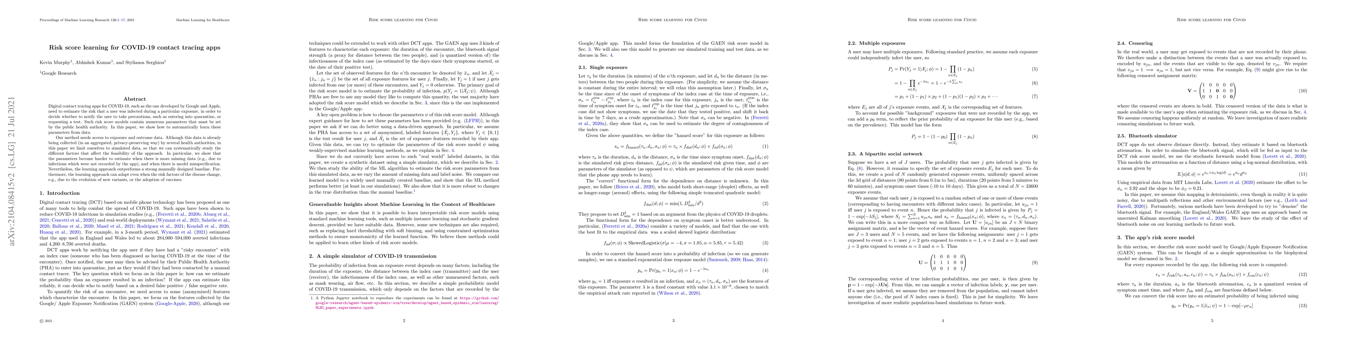 Digital contact tracing apps for COVID, such as the one developed by Google and Apple, need to estimate the risk that a user was infected during a particular exposure, in order to decide whether to notify the user to take precautions, such as entering into quarantine, or requesting a test. Such risk score models contain numerous parameters that must be set by the public health authority. In this paper, we show how to automatically learn these parameters from data. Our method needs access to exposure and outcome data. Although this data is already being collected (in an aggregated, privacy-preserving way) by several health authorities, in this paper we limit ourselves to simulated data, so that we can systematically study the different factors that affect the feasibility of the approach. In particular, we show that the parameters become harder to estimate when there is more missing data (e.g., due to infections which were not recorded by the app), and when there is model misspecification. Nevertheless, the learning approach outperforms a strong manually designed baseline. Furthermore, the learning approach can adapt even when the risk factors of the disease change, e.g., due to the evolution of new variants, or the adoption of vaccines.