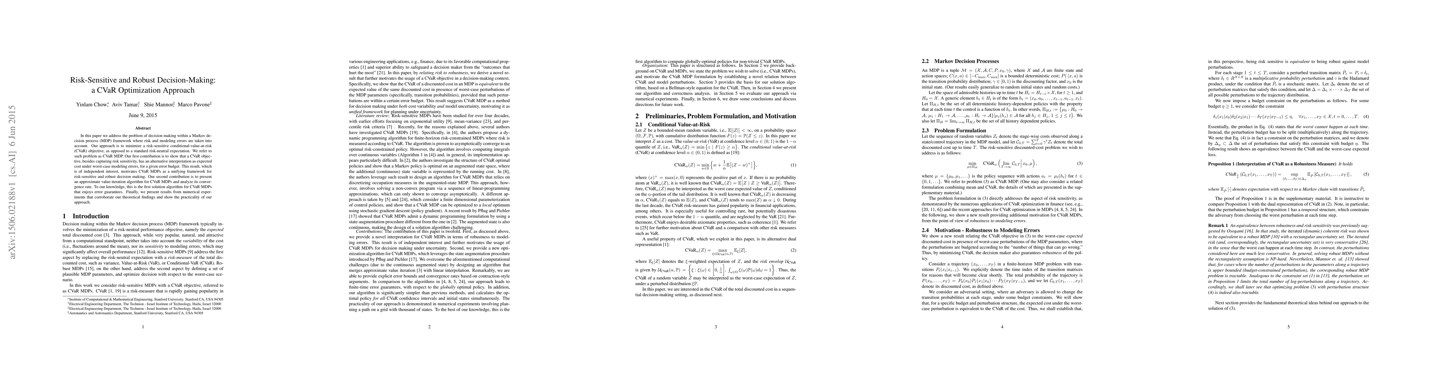 This paper proposes a CVaR optimization approach for risk-sensitive and robust decision-making within a Markov decision process framework, showing its dual interpretation as expected cost under worst-case modeling errors. It introduces an approximate value-iteration algorithm for solving CVaR MDPs and demonstrates its convergence rate and practical effectiveness through numerical experiments.