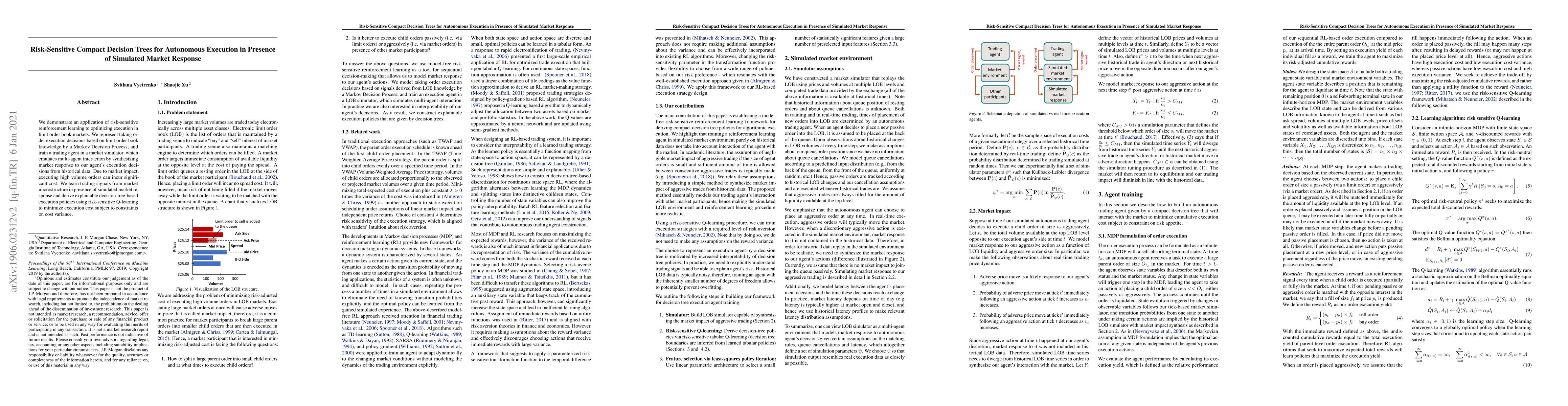 We demonstrate an application of risk-sensitive reinforcement learning to optimizing execution in limit order book markets. We represent taking order execution decisions based on limit order book knowledge by a Markov Decision Process; and train a trading agent in a market simulator, which emulates multi-agent interaction by synthesizing market response to our agent's execution decisions from historical data. Due to market impact, executing high volume orders can incur significant cost. We learn trading signals from market microstructure in presence of simulated market response and derive explainable decision-tree-based execution policies using risk-sensitive Q-learning to minimize execution cost subject to constraints on cost variance.