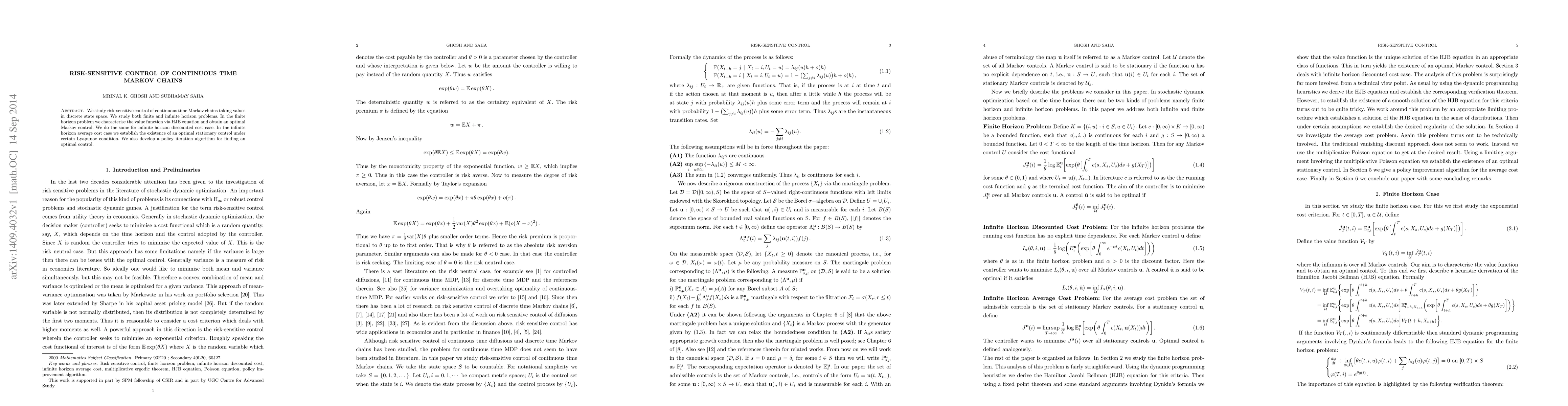 This paper investigates risk-sensitive control strategies for continuous time Markov chains with discrete states, focusing on both finite and infinite horizon problems. It characterizes value functions via Hamilton-Jacobi-Bellman (HJB) equations and develops algorithms to find optimal controls under various cost criteria.