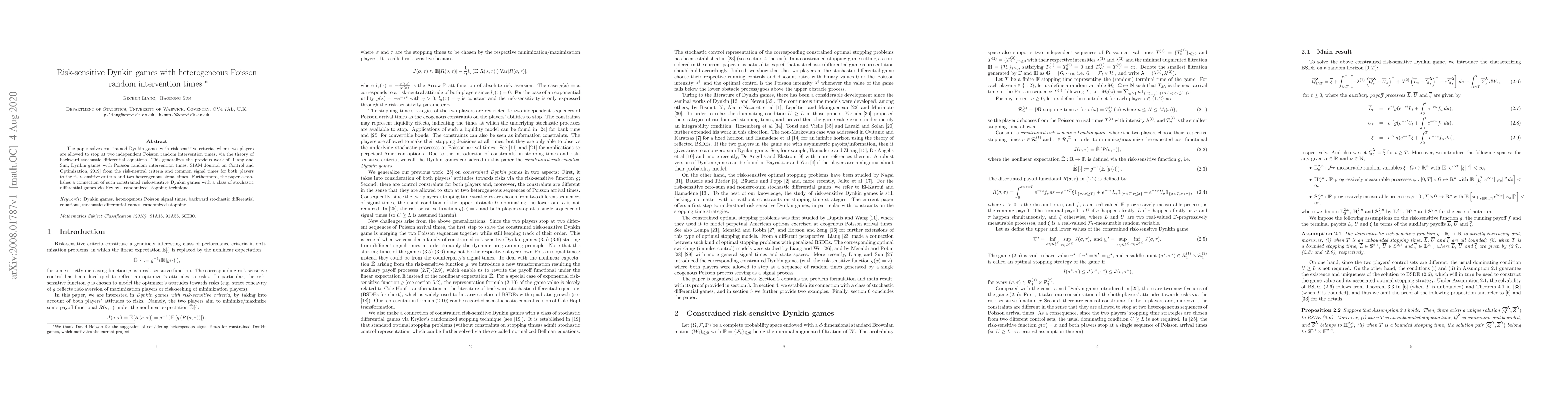 Researchers developed a framework for solving constrained Dynkin games with risk-sensitive criteria and two independent Poisson random intervention times, generalizing previous work on risk-neutral criteria and common signal times.