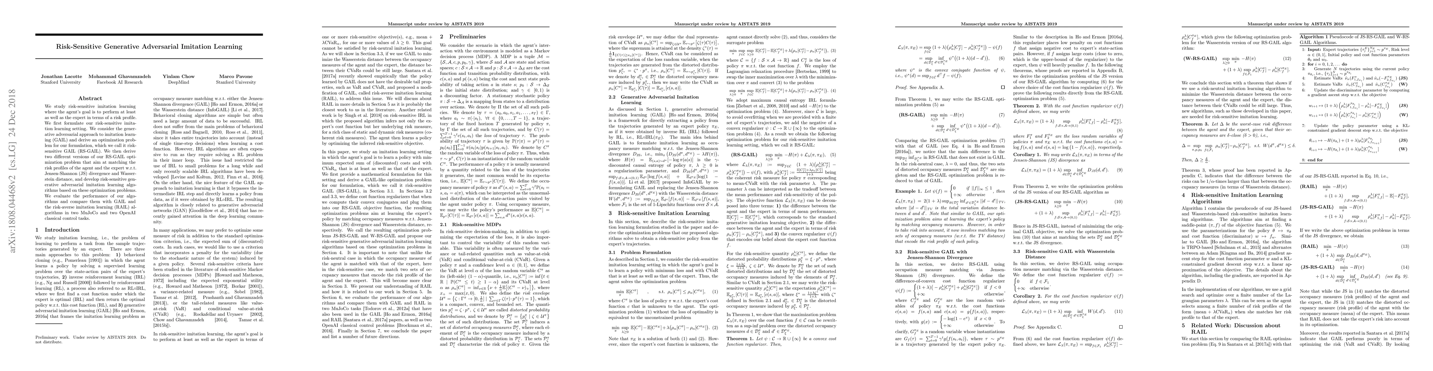 This paper proposes a risk-sensitive variant of Generative Adversarial Imitation Learning (RS-GAIL) to match the agent's risk profile to that of an expert. It develops two RS-GAIL algorithms based on Jensen-Shannon divergence and Wasserstein distance, and evaluates them against GAIL and RAIL in control tasks.