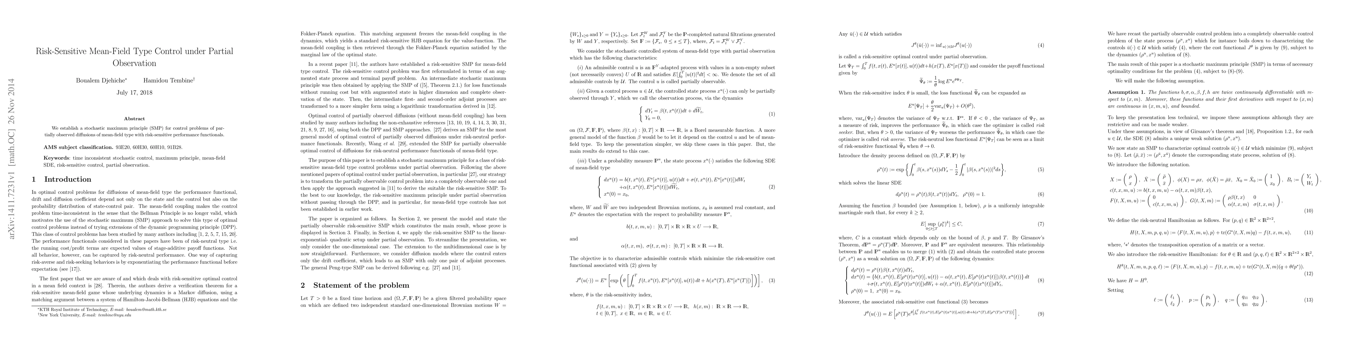 Summary: The paper develops a stochastic maximum principle (SMP) for mean-field type control problems involving partially observed diffusions, focusing on risk-sensitive performance criteria. The SMP provides a framework for optimal control under uncertainty and partial information.