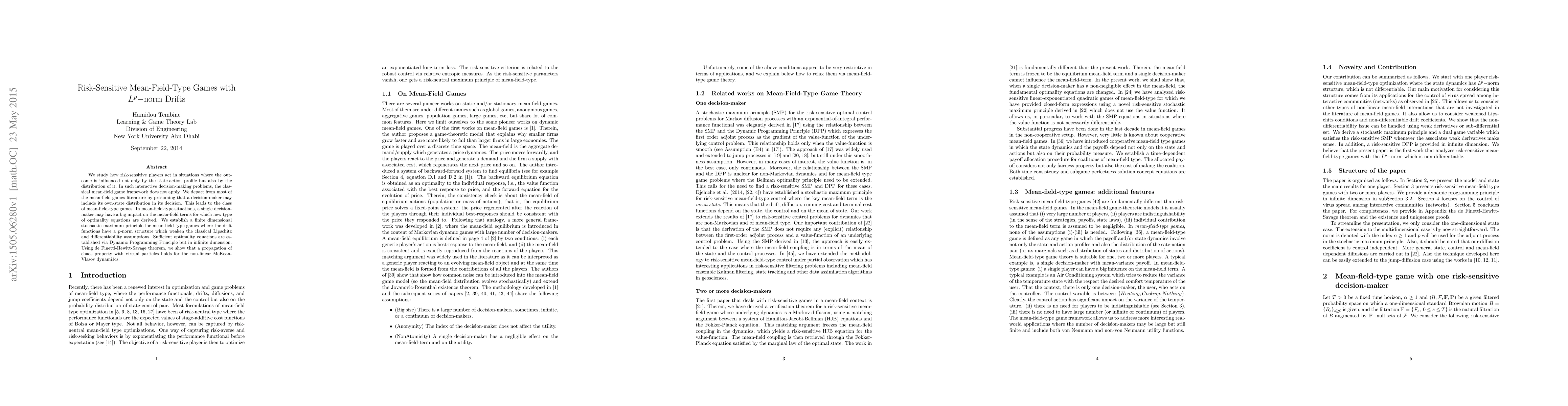 We study how risk-sensitive players act in situations where the outcome is influenced not only by the state-action profile but also by the distribution of it. In such interactive decision-making problems, the classical mean-field game framework does not apply. We depart from most of the mean-field games literature by presuming that a decision-maker may include its own-state distribution in its decision. This leads to the class of mean-field-type games. In mean-field-type situations, a single decision-maker may have a big impact on the mean-field terms for which new type of optimality equations are derived. We establish a finite dimensional stochastic maximum principle for mean-field-type games where the drift functions have a p-norm structure which weaken the classical Lipschitz and differentiability assumptions. Sufficient optimality equations are established via Dynamic Programming Principle but in infinite dimension. Using de Finetti-Hewitt-Savage theorem, we show that a propagation of chaos property with 'virtual' particles holds for the non-linear McKean-Vlasov dynamics.