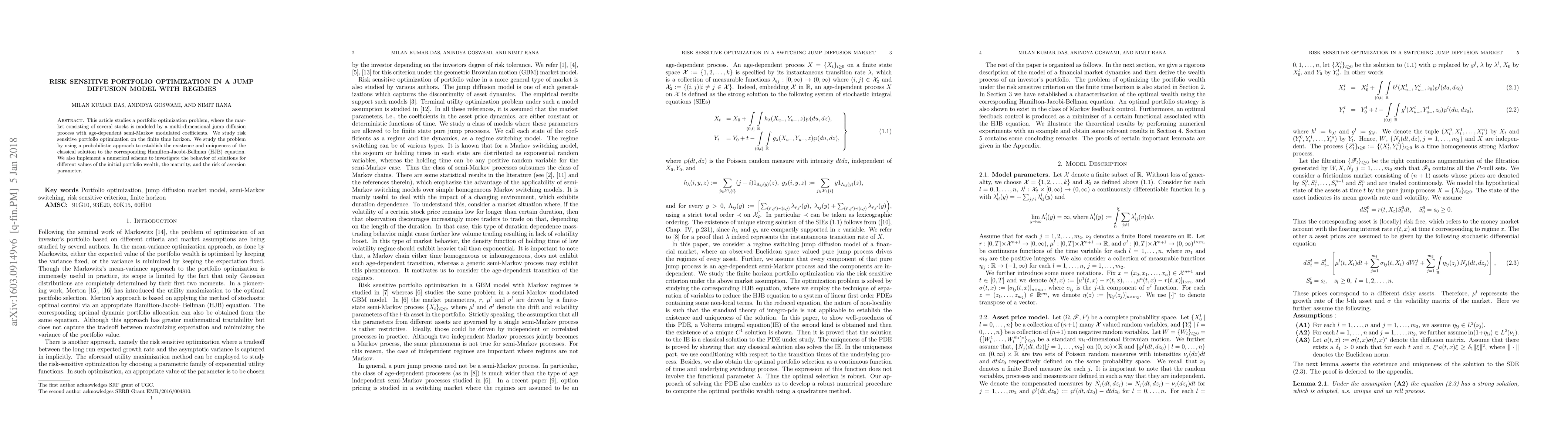 This article studies a portfolio optimization problem, where the market consisting of several stocks is modeled by a multi-dimensional jump-diffusion process with age-dependent semi-Markov modulated coefficients. We study risk sensitive portfolio optimization on the finite time horizon. We study the problem by using a probabilistic approach to establish the existence and uniqueness of the classical solution to the corresponding Hamilton-Jacobi-Bellman (HJB) equation. We also implement a numerical scheme to investigate the behavior of solutions for different values of the initial portfolio wealth, the maturity, and the risk of aversion parameter.