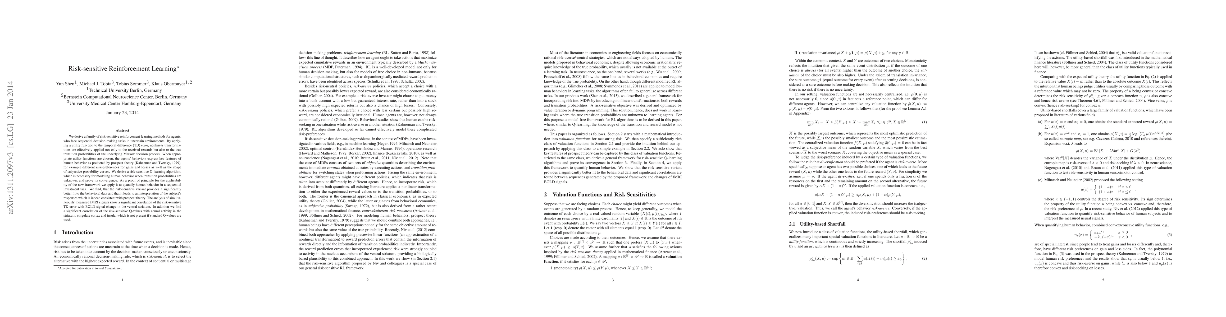 We derive a family of risk-sensitive reinforcement learning methods for agents, who face sequential decision-making tasks in uncertain environments. By applying a utility function to the temporal difference (TD) error, nonlinear transformations are effectively applied not only to the received rewards but also to the true transition probabilities of the underlying Markov decision process. When appropriate utility functions are chosen, the agents' behaviors express key features of human behavior as predicted by prospect theory (Kahneman and Tversky, 1979), for example different risk-preferences for gains and losses as well as the shape of subjective probability curves. We derive a risk-sensitive Q-learning algorithm, which is necessary for modeling human behavior when transition probabilities are unknown, and prove its convergence. As a proof of principle for the applicability of the new framework we apply it to quantify human behavior in a sequential investment task. We find, that the risk-sensitive variant provides a significantly better fit to the behavioral data and that it leads to an interpretation of the subject's responses which is indeed consistent with prospect theory. The analysis of simultaneously measured fMRI signals show a significant correlation of the risk-sensitive TD error with BOLD signal change in the ventral striatum. In addition we find a significant correlation of the risk-sensitive Q-values with neural activity in the striatum, cingulate cortex and insula, which is not present if standard Q-values are used.