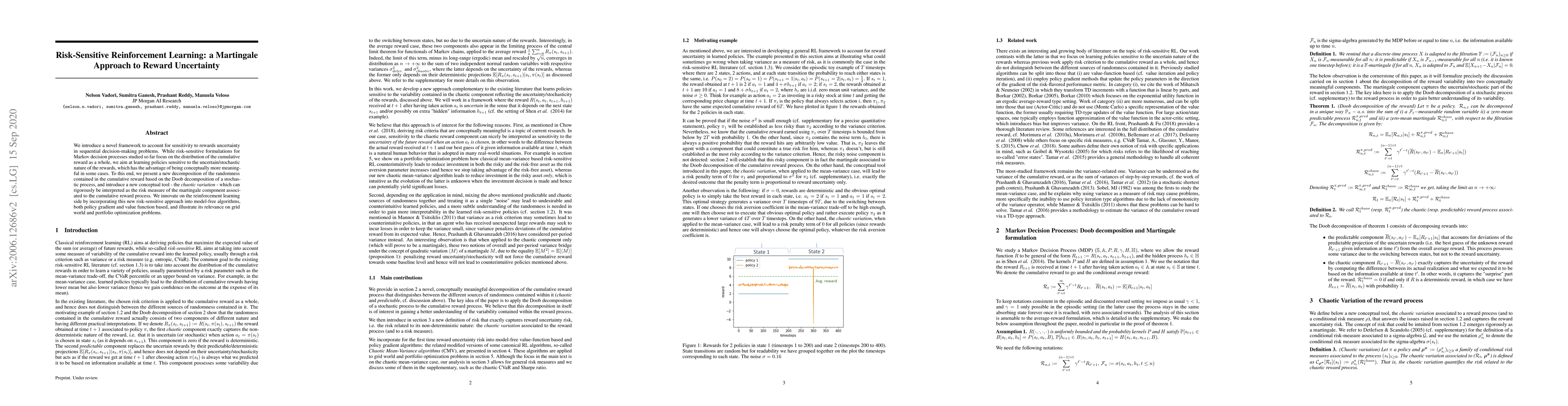 We introduce a novel framework to account for sensitivity to rewards uncertainty in sequential decision-making problems. While risk-sensitive formulations for Markov decision processes studied so far focus on the distribution of the cumulative reward as a whole, we aim at learning policies sensitive to the uncertain/stochastic nature of the rewards, which has the advantage of being conceptually more meaningful in some cases. To this end, we present a new decomposition of the randomness contained in the cumulative reward based on the Doob decomposition of a stochastic process, and introduce a new conceptual tool - the \textit{chaotic variation} - which can rigorously be interpreted as the risk measure of the martingale component associated to the cumulative reward process. We innovate on the reinforcement learning side by incorporating this new risk-sensitive approach into model-free algorithms, both policy gradient and value function based, and illustrate its relevance on grid world and portfolio optimization problems.