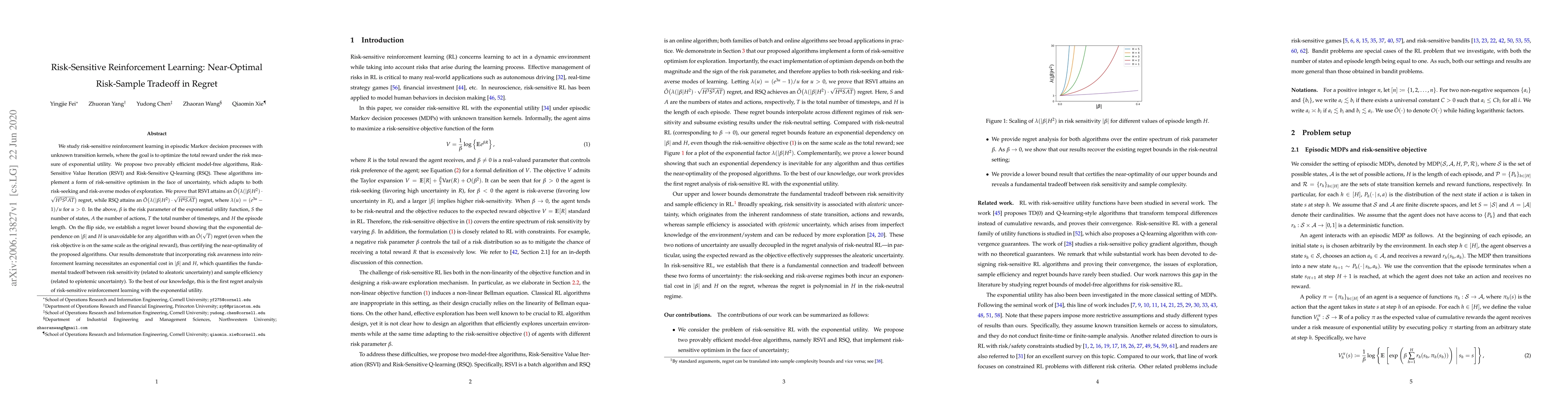 We study risk-sensitive reinforcement learning in episodic Markov decision processes with unknown transition kernels, where the goal is to optimize the total reward under the risk measure of exponential utility. We propose two provably efficient model-free algorithms, Risk-Sensitive Value Iteration (RSVI) and Risk-Sensitive Q-learning (RSQ). These algorithms implement a form of risk-sensitive optimism in the face of uncertainty, which adapts to both risk-seeking and risk-averse modes of exploration. We prove that RSVI attains an $\tilde{O}\big(\lambda(|\beta| H^2) \cdot \sqrt{H^{3} S^{2}AT} \big)$ regret, while RSQ attains an $\tilde{O}\big(\lambda(|\beta| H^2) \cdot \sqrt{H^{4} SAT} \big)$ regret, where $\lambda(u) = (e^{3u}-1)/u$ for $u>0$. In the above, $\beta$ is the risk parameter of the exponential utility function, $S$ the number of states, $A$ the number of actions, $T$ the total number of timesteps, and $H$ the episode length. On the flip side, we establish a regret lower bound showing that the exponential dependence on $|\beta|$ and $H$ is unavoidable for any algorithm with an $\tilde{O}(\sqrt{T})$ regret (even when the risk objective is on the same scale as the original reward), thus certifying the near-optimality of the proposed algorithms. Our results demonstrate that incorporating risk awareness into reinforcement learning necessitates an exponential cost in $|\beta|$ and $H$, which quantifies the fundamental tradeoff between risk sensitivity (related to aleatoric uncertainty) and sample efficiency (related to epistemic uncertainty). To the best of our knowledge, this is the first regret analysis of risk-sensitive reinforcement learning with the exponential utility.