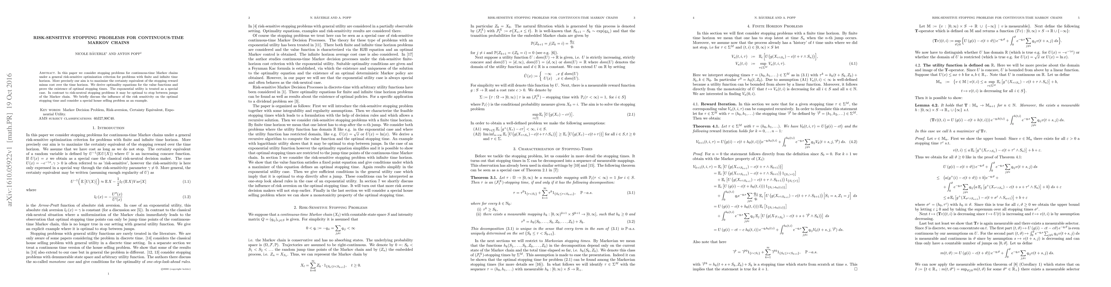 This paper investigates stopping problems for continuous-time Markov chains under risk-sensitive criteria, deriving optimality equations for value functions and proving the existence of optimal stopping times. Unlike risk-neutral approaches, it finds that stopping between jumps may be optimal, illustrated through an example of a house selling problem.