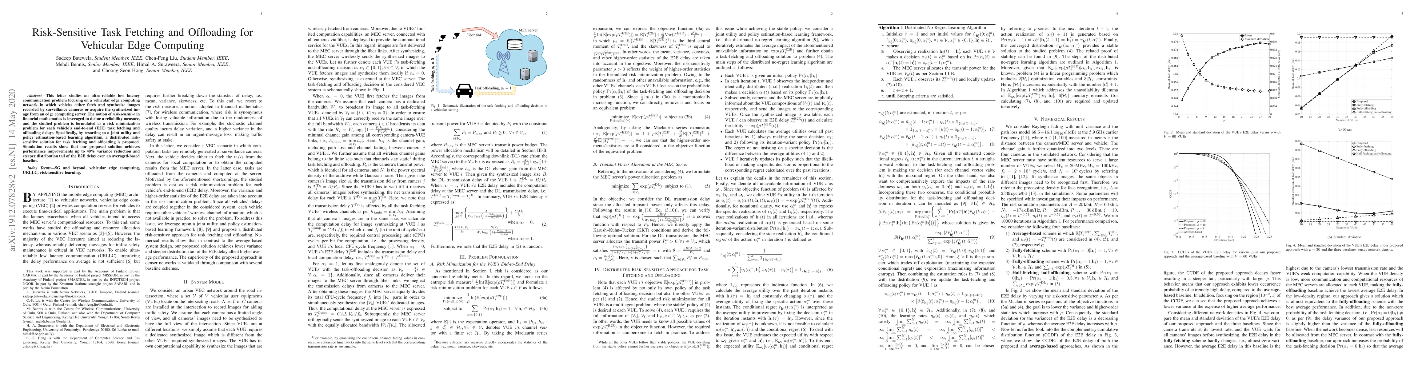 This paper proposes a risk-sensitive approach to optimize task fetching and offloading in vehicular edge computing networks, achieving up to 40% variance reduction in end-to-end delays compared to baseline methods. The solution leverages a joint utility and policy estimation-based learning algorithm for distributed risk minimization.