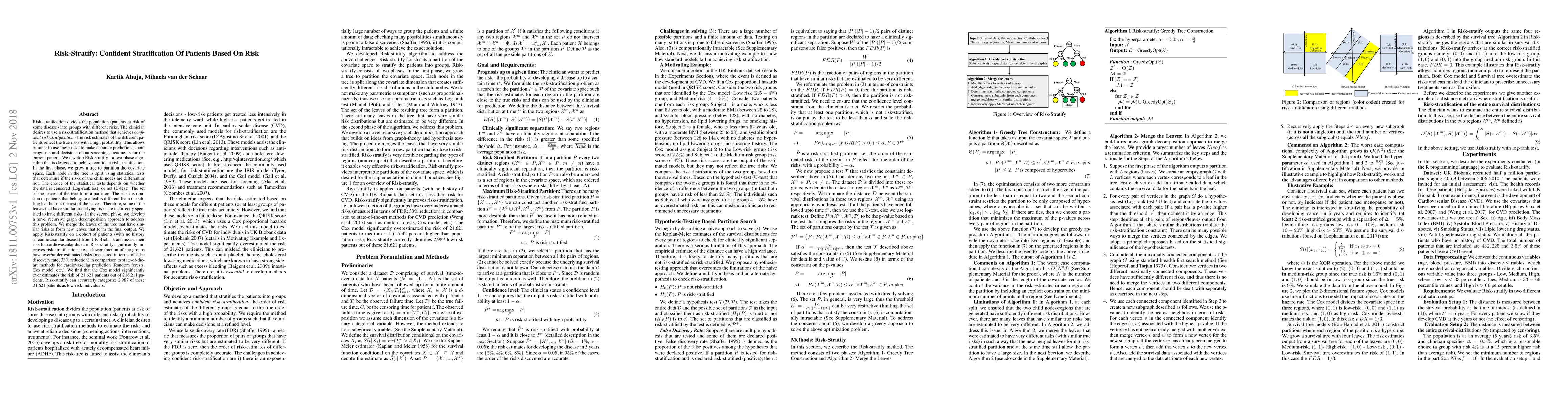A clinician desires to use a risk-stratification method that achieves confident risk-stratification - the risk estimates of the different patients reflect the true risks with a high probability. This allows him/her to use these risks to make accurate predictions about prognosis and decisions about screening, treatments for the current patient. We develop Risk-stratify - a two phase algorithm that is designed to achieve confident risk-stratification. In the first phase, we grow a tree to partition the covariate space. Each node in the tree is split using statistical tests that determine if the risks of the child nodes are different or not. The choice of the statistical tests depends on whether the data is censored (Log-rank test) or not (U-test). The set of the leaves of the tree form a partition. The risk distribution of patients that belong to a leaf is different from the sibling leaf but not the rest of the leaves. Therefore, some of the leaves that have similar underlying risks are incorrectly specified to have different risks. In the second phase, we develop a novel recursive graph decomposition approach to address this problem. We merge the leaves of the tree that have similar risks to form new leaves that form the final output. We apply Risk-stratify on a cohort of patients (with no history of cardiovascular disease) from UK Biobank and assess their risk for cardiovascular disease. Risk-stratify significantly improves risk-stratification, i.e., a lower fraction of the groups have over/under estimated risks (measured in terms of false discovery rate; 33% reduction) in comparison to state-of-the-art methods for cardiovascular prediction (Random forests, Cox model, etc.). We find that the Cox model significantly over estimates the risk of 21,621 patients out of 216,211 patients. Risk-stratify can accurately categorize 2,987 of these 21,621 patients as low-risk individuals.