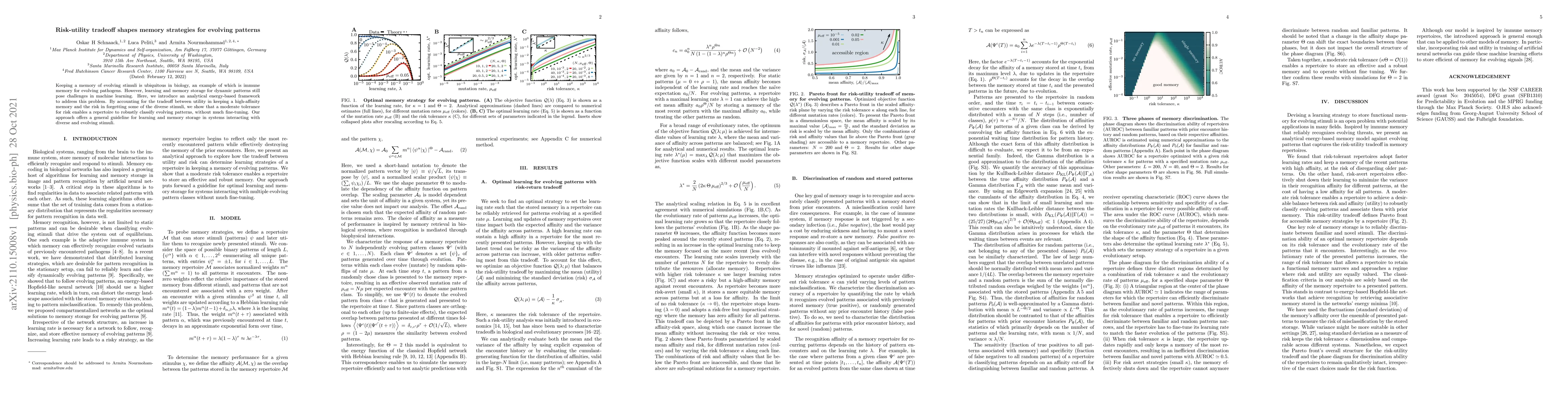 The research presents an energy-based framework to tackle the challenge of memory storage for dynamic patterns, as seen in biological immune responses and machine learning. This framework balances the utility of high-affinity memory with the risk of forgetting diverse stimuli, demonstrating that moderate risk tolerance enables robust classification of evolving patterns with minimal fine-tuning, offering a general guideline for learning and memory in diverse, evolving stimuli systems.