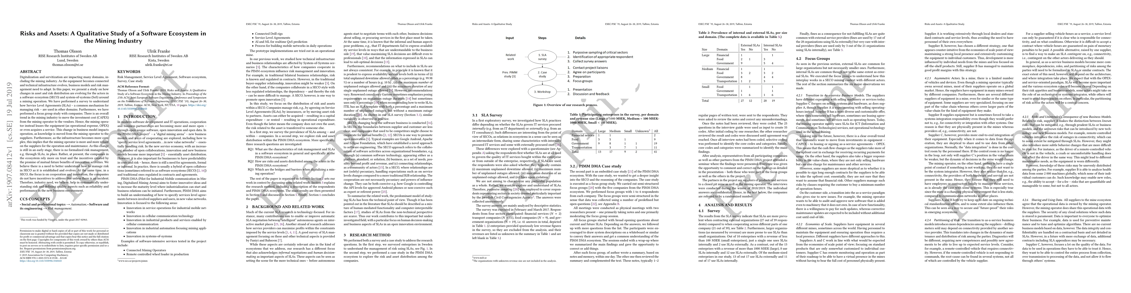 A study in the mining industry explores how software ecosystems and system-of-systems impact risk management and asset distribution as equipment becomes connected and infrastructure evolves. The research highlights the need for a systematic approach to managing risk and defining quality aspects in this new business environment.