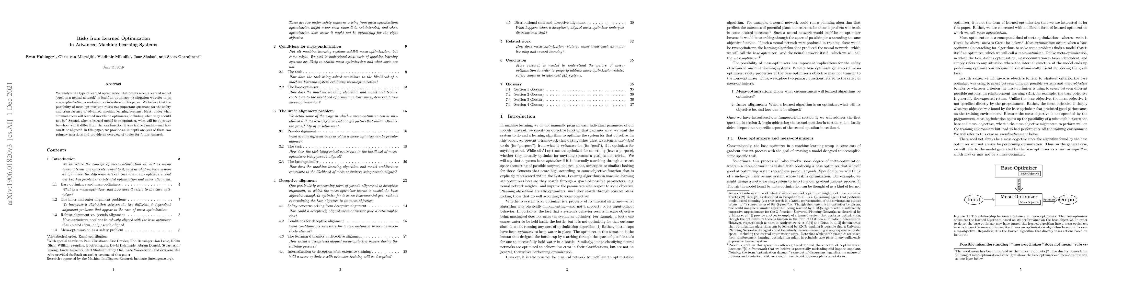 We analyze the type of learned optimization that occurs when a learned model (such as a neural network) is itself an optimizer - a situation we refer to as mesa-optimization, a neologism we introduce in this paper. We believe that the possibility of mesa-optimization raises two important questions for the safety and transparency of advanced machine learning systems. First, under what circumstances will learned models be optimizers, including when they should not be? Second, when a learned model is an optimizer, what will its objective be - how will it differ from the loss function it was trained under - and how can it be aligned? In this paper, we provide an in-depth analysis of these two primary questions and provide an overview of topics for future research.