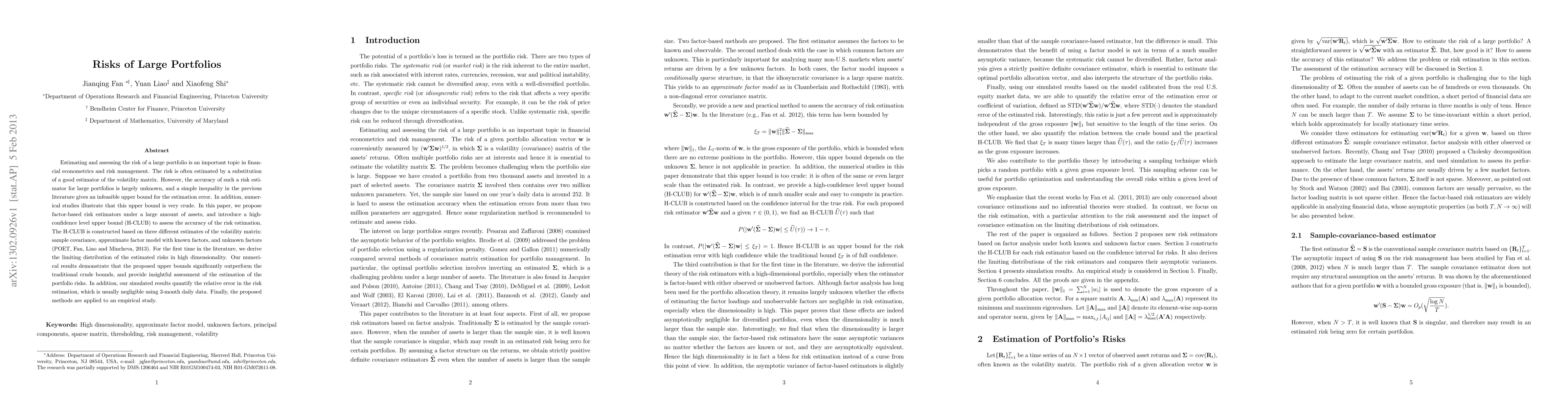 Estimating and assessing the risk of a large portfolio is an important topic in financial econometrics and risk management. The risk is often estimated by a substitution of a good estimator of the volatility matrix. However, the accuracy of such a risk estimator for large portfolios is largely unknown, and a simple inequality in the previous literature gives an infeasible upper bound for the estimation error. In addition, numerical studies illustrate that this upper bound is very crude. In this paper, we propose factor-based risk estimators under a large amount of assets, and introduce a high-confidence level upper bound (H-CLUB) to assess the accuracy of the risk estimation. The H-CLUB is constructed based on three different estimates of the volatility matrix: sample covariance, approximate factor model with known factors, and unknown factors (POET, Fan, Liao and Mincheva, 2013). For the first time in the literature, we derive the limiting distribution of the estimated risks in high dimensionality. Our numerical results demonstrate that the proposed upper bounds significantly outperform the traditional crude bounds, and provide insightful assessment of the estimation of the portfolio risks. In addition, our simulated results quantify the relative error in the risk estimation, which is usually negligible using 3-month daily data. Finally, the proposed methods are applied to an empirical study.