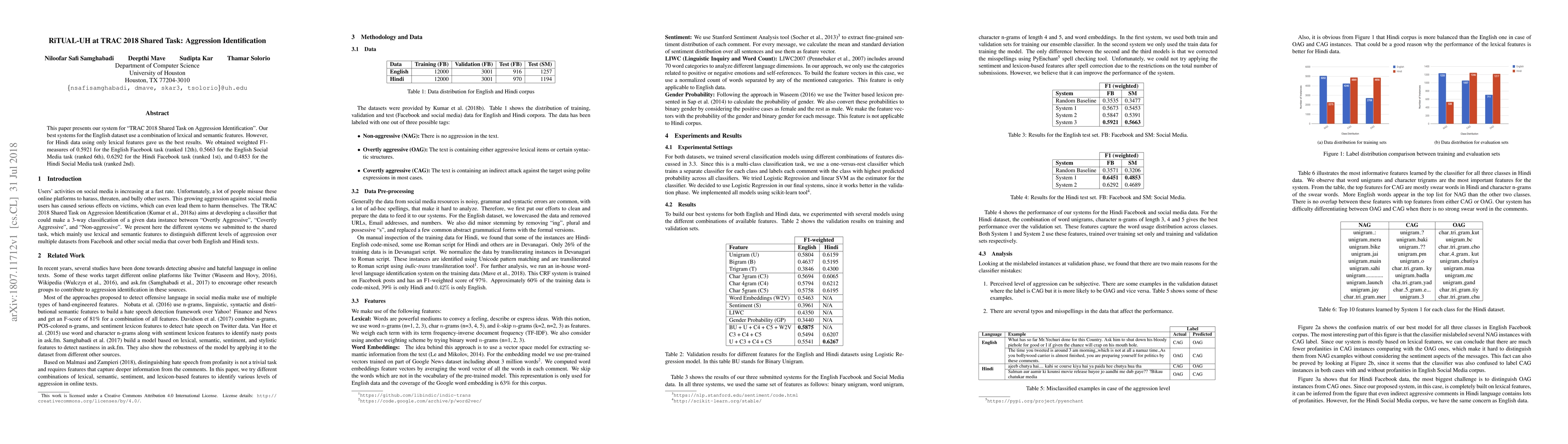 This paper presents our system for "TRAC 2018 Shared Task on Aggression Identification". Our best systems for the English dataset use a combination of lexical and semantic features. However, for Hindi data using only lexical features gave us the best results. We obtained weighted F1- measures of 0.5921 for the English Facebook task (ranked 12th), 0.5663 for the English Social Media task (ranked 6th), 0.6292 for the Hindi Facebook task (ranked 1st), and 0.4853 for the Hindi Social Media task (ranked 2nd).