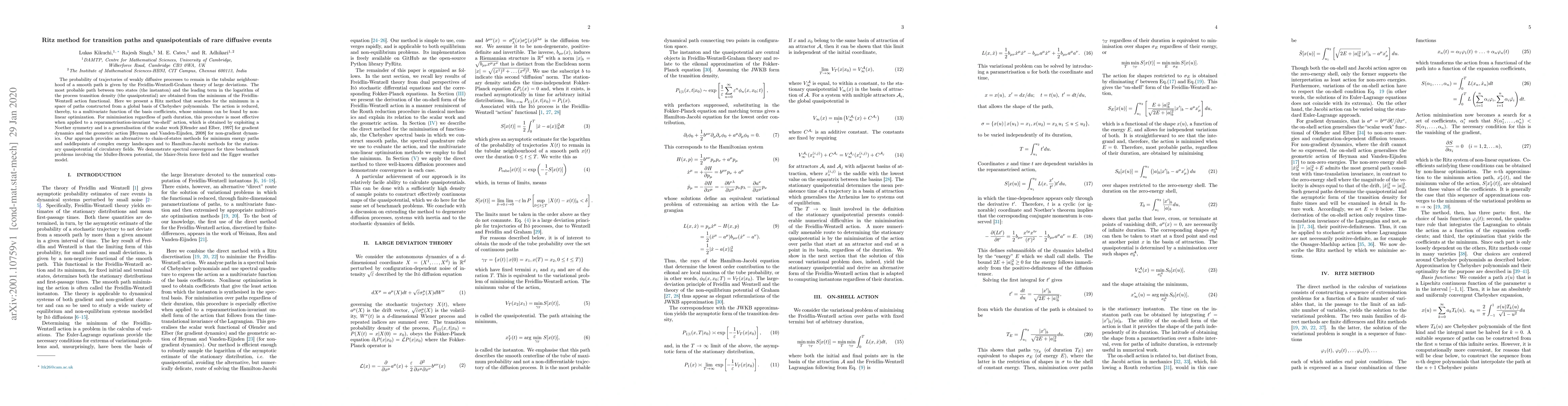 The probability of trajectories of weakly diffusive processes to remain in the tubular neighbourhood of a smooth path is given by the Freidlin-Wentzell-Graham theory of large deviations. The most probable path between two states (the instanton) and the leading term in the logarithm of the process transition density (the quasipotential) are obtained from the minimum of the Freidlin-Wentzell action functional. Here we present a Ritz method that searches for the minimum in a space of paths constructed from a global basis of Chebyshev polynomials. The action is reduced, thereby, to a multivariate function of the basis coefficients, whose minimum can be found by nonlinear optimization. For minimisation regardless of path duration, this procedure is most effective when applied to a reparametrisation-invariant "on-shell" action, which is obtained by exploiting a Noether symmetry and is a generalisation of the scalar work [Olender and Elber, 1997] for gradient dynamics and the geometric action [Heyman and Vanden-Eijnden, 2008] for non-gradient dynamics. Our approach provides an alternative to chain-of-states methods for minimum energy paths and saddlepoints of complex energy landscapes and to Hamilton-Jacobi methods for the stationary quasipotential of circulatory fields. We demonstrate spectral convergence for three benchmark problems involving the Muller-Brown potential, the Maier-Stein force field and the Egger weather model.