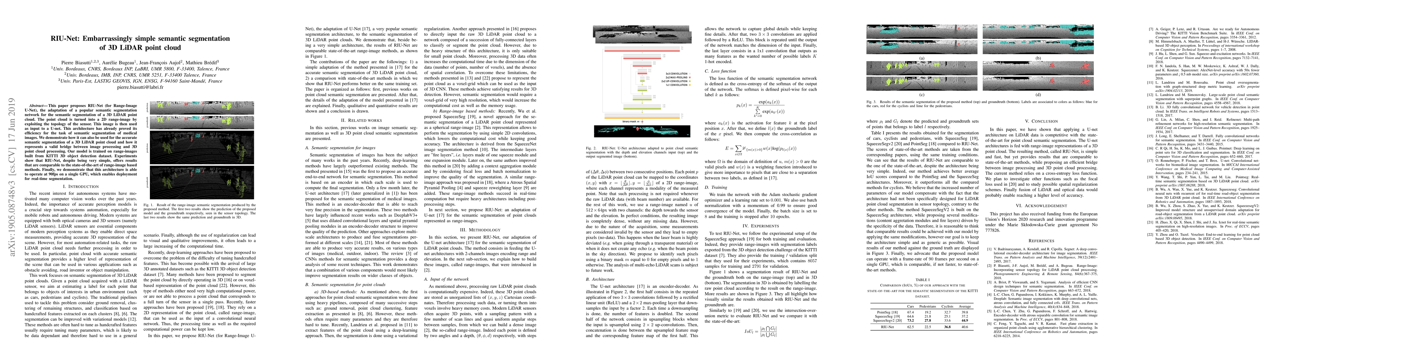 RIU-Net adapts a U-Net architecture for semantic segmentation of 3D LiDAR point clouds by converting them into 2D range-images, achieving results comparable to state-of-the-art methods while operating at 90fps on a single GPU for real-time deployment.