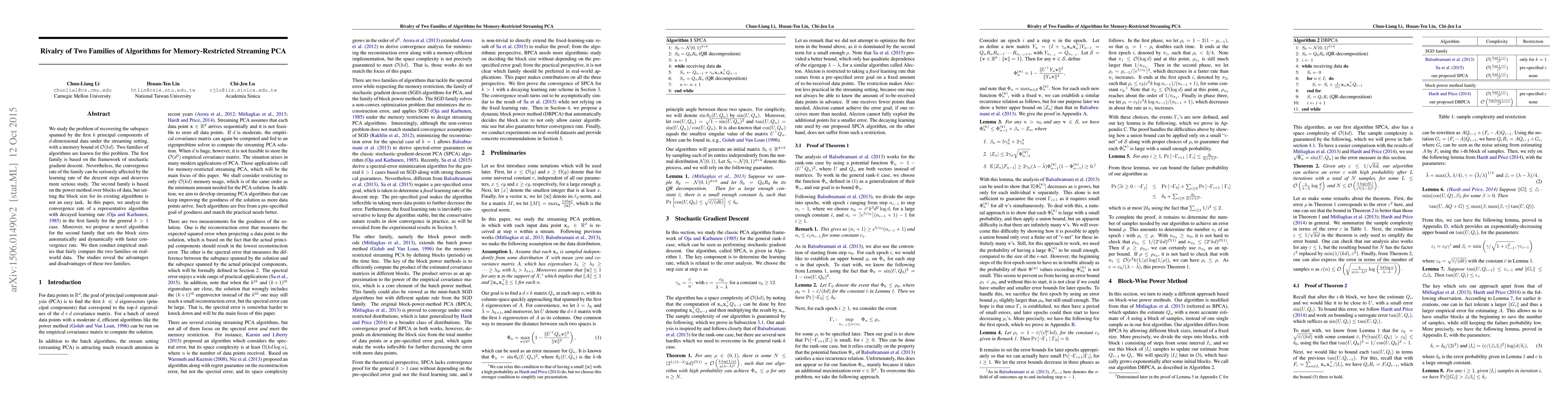 We study the problem of recovering the subspace spanned by the first $k$ principal components of $d$-dimensional data under the streaming setting, with a memory bound of $O(kd)$. Two families of algorithms are known for this problem. The first family is based on the framework of stochastic gradient descent. Nevertheless, the convergence rate of the family can be seriously affected by the learning rate of the descent steps and deserves more serious study. The second family is based on the power method over blocks of data, but setting the block size for its existing algorithms is not an easy task. In this paper, we analyze the convergence rate of a representative algorithm with decayed learning rate (Oja and Karhunen, 1985) in the first family for the general $k>1$ case. Moreover, we propose a novel algorithm for the second family that sets the block sizes automatically and dynamically with faster convergence rate. We then conduct empirical studies that fairly compare the two families on real-world data. The studies reveal the advantages and disadvantages of these two families.
