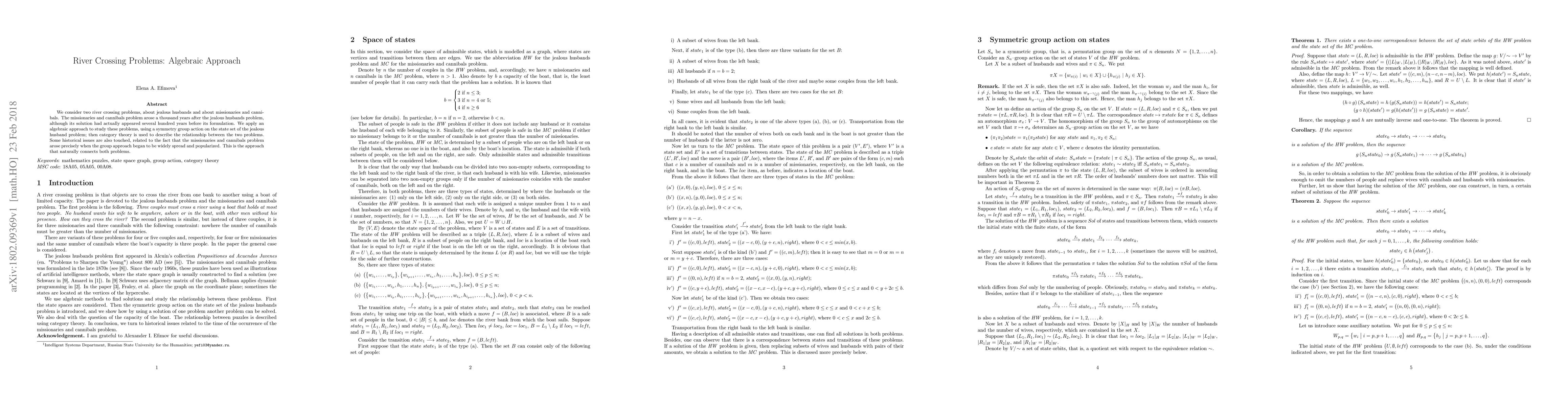 We consider two river crossing problems, about jealous husbands and about missionaries and cannibals. The missionaries and cannibals problem arose a thousand years after the jealous husbands problem, although its solution had actually appeared several hundred years before its formulation. We apply an algebraic approach to study these problems, using a symmetry group action on the state set of the jealous husband problem; then category theory is used to describe the relationship between the two problems. Some historical issues are also touched, related to the fact that the missionaries and cannibals problem arose precisely when the group approach began to be widely spread and popularized. This is the approach that naturally connects both problems.