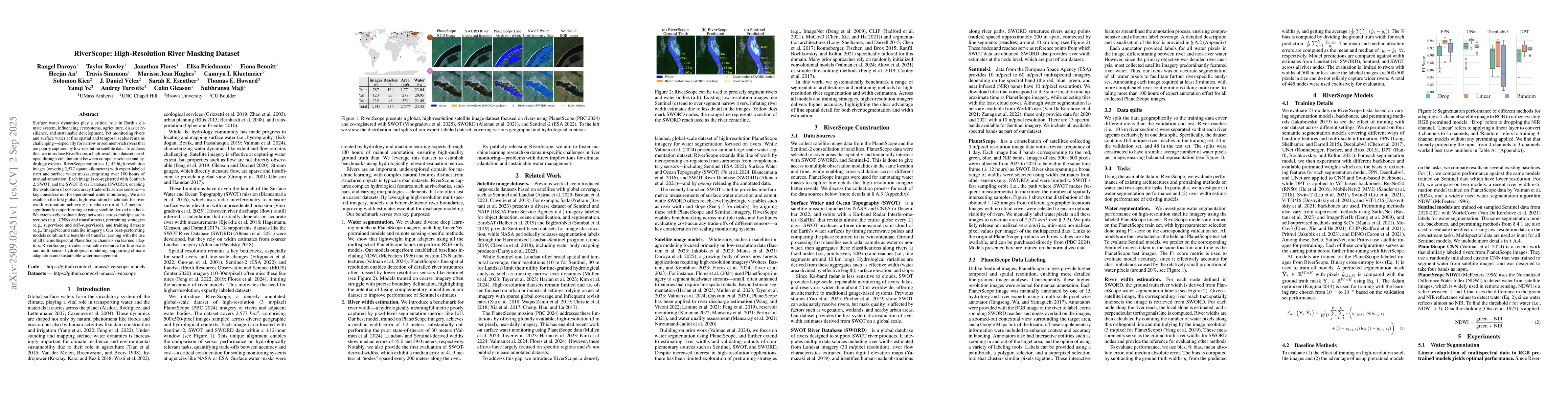 Surface water dynamics play a critical role in Earth's climate system, influencing ecosystems, agriculture, disaster resilience, and sustainable development. Yet monitoring rivers and surface water at fine spatial and temporal scales remains challenging -- especially for narrow or sediment-rich rivers that are poorly captured by low-resolution satellite data. To address this, we introduce RiverScope, a high-resolution dataset developed through collaboration between computer science and hydrology experts. RiverScope comprises 1,145 high-resolution images (covering 2,577 square kilometers) with expert-labeled river and surface water masks, requiring over 100 hours of manual annotation. Each image is co-registered with Sentinel-2, SWOT, and the SWOT River Database (SWORD), enabling the evaluation of cost-accuracy trade-offs across sensors -- a key consideration for operational water monitoring. We also establish the first global, high-resolution benchmark for river width estimation, achieving a median error of 7.2 meters -- significantly outperforming existing satellite-derived methods. We extensively evaluate deep networks across multiple architectures (e.g., CNNs and transformers), pretraining strategies (e.g., supervised and self-supervised), and training datasets (e.g., ImageNet and satellite imagery). Our best-performing models combine the benefits of transfer learning with the use of all the multispectral PlanetScope channels via learned adaptors. RiverScope provides a valuable resource for fine-scale and multi-sensor hydrological modeling, supporting climate adaptation and sustainable water management.