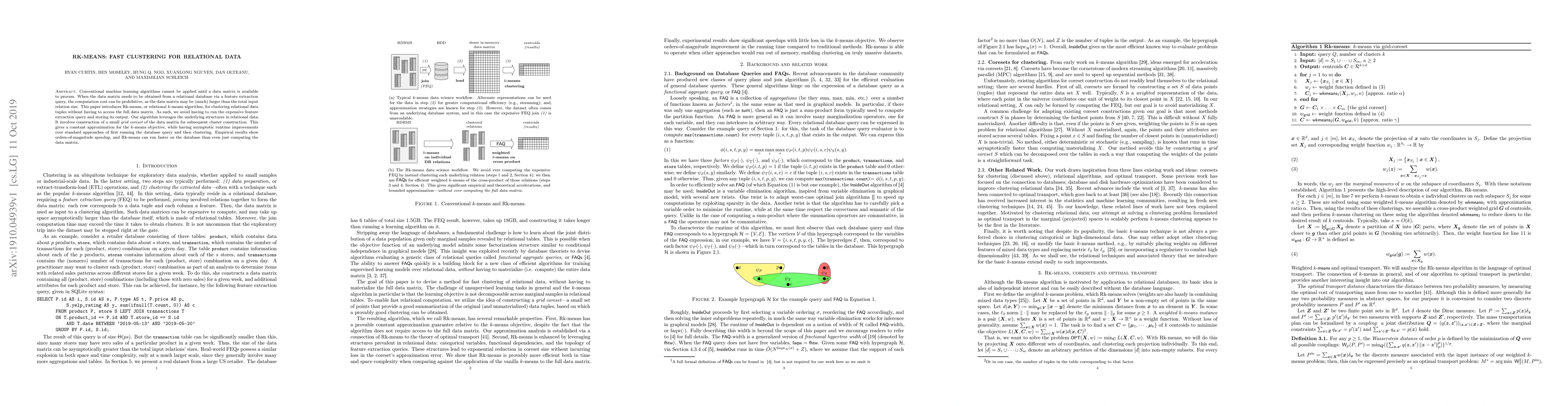 Conventional machine learning algorithms cannot be applied until a data matrix is available to process. When the data matrix needs to be obtained from a relational database via a feature extraction query, the computation cost can be prohibitive, as the data matrix may be (much) larger than the total input relation size. This paper introduces Rk-means, or relational k -means algorithm, for clustering relational data tuples without having to access the full data matrix. As such, we avoid having to run the expensive feature extraction query and storing its output. Our algorithm leverages the underlying structures in relational data. It involves construction of a small {\it grid coreset} of the data matrix for subsequent cluster construction. This gives a constant approximation for the k -means objective, while having asymptotic runtime improvements over standard approaches of first running the database query and then clustering. Empirical results show orders-of-magnitude speedup, and Rk-means can run faster on the database than even just computing the data matrix.